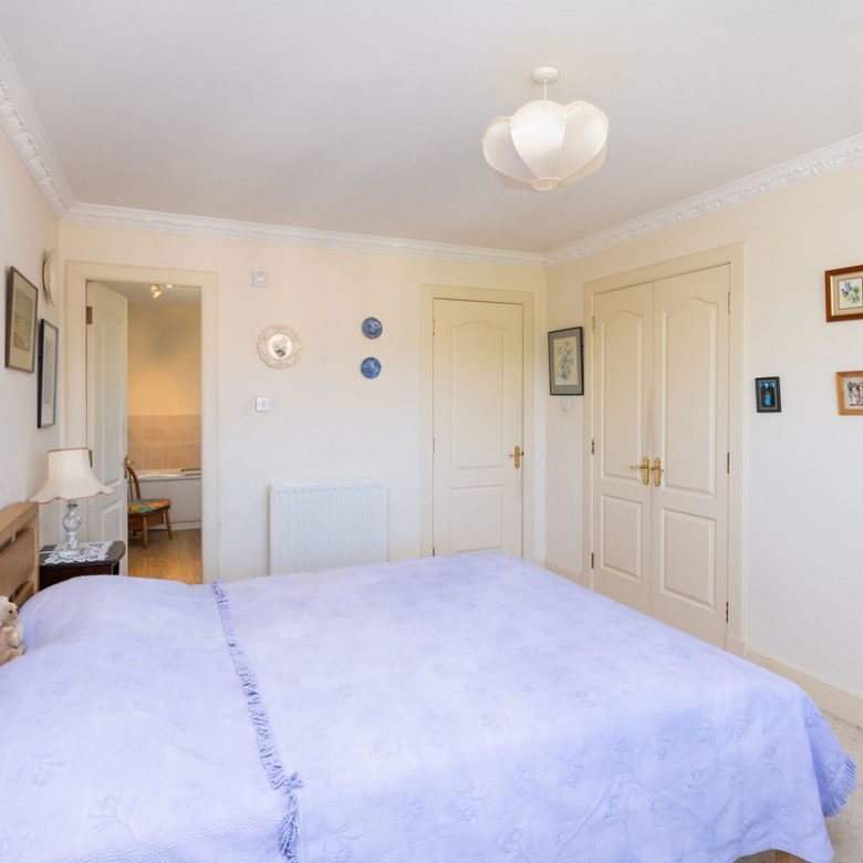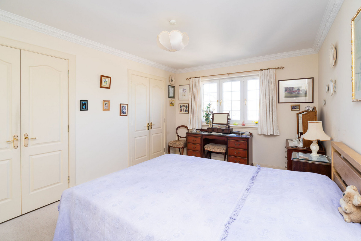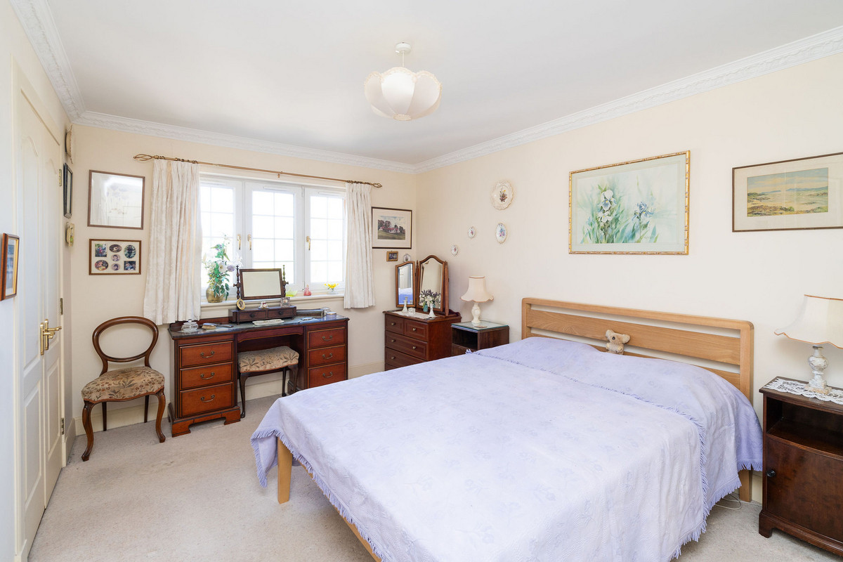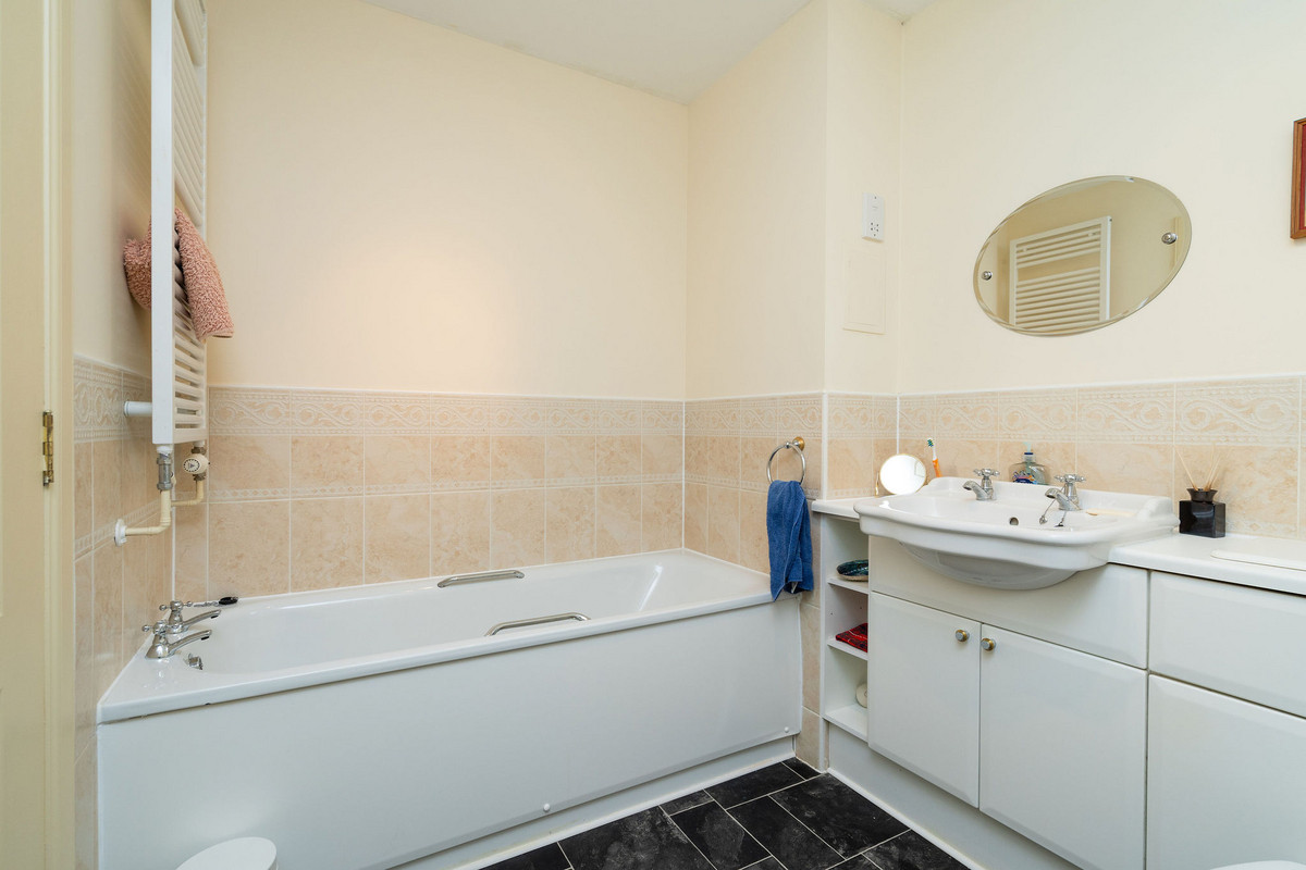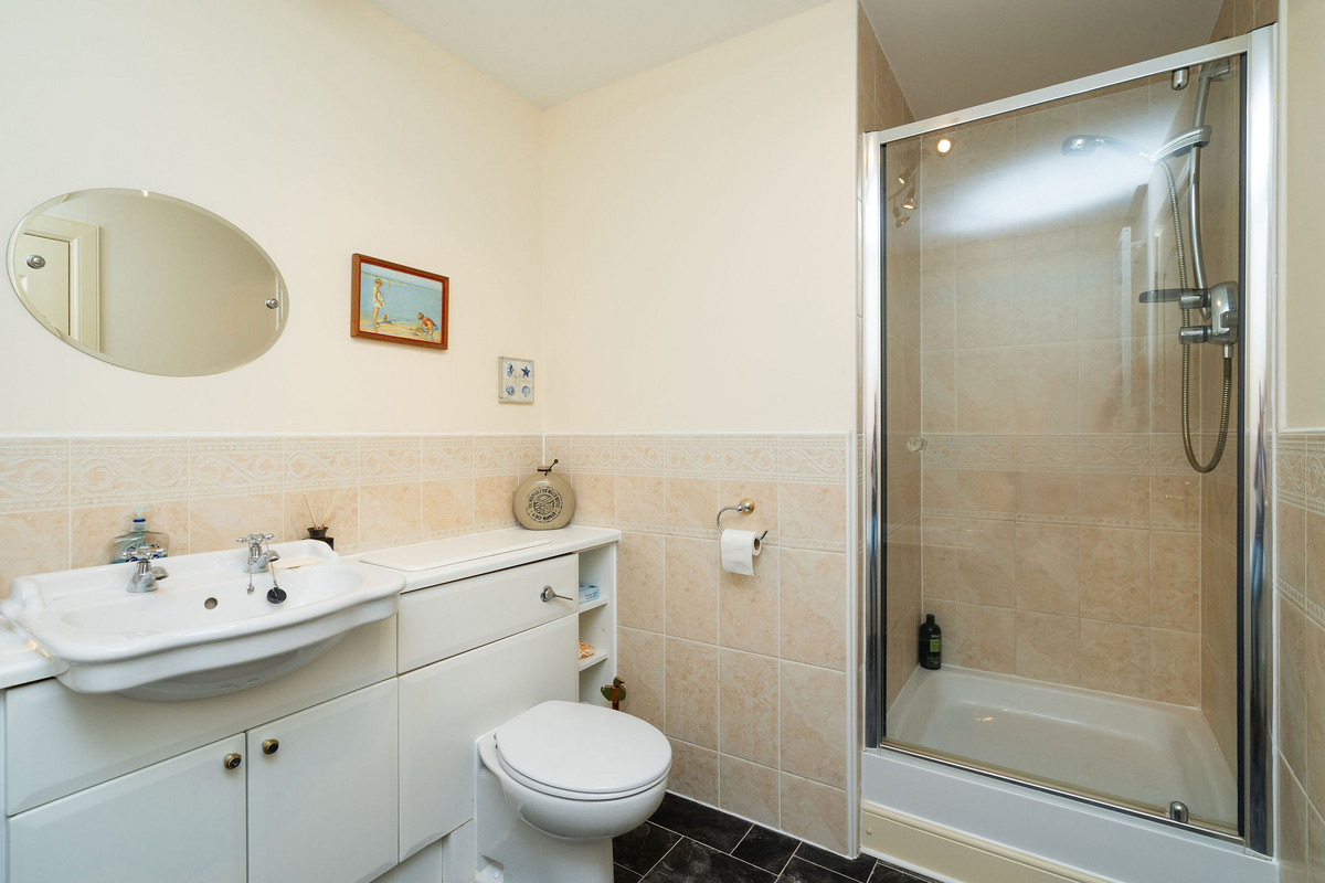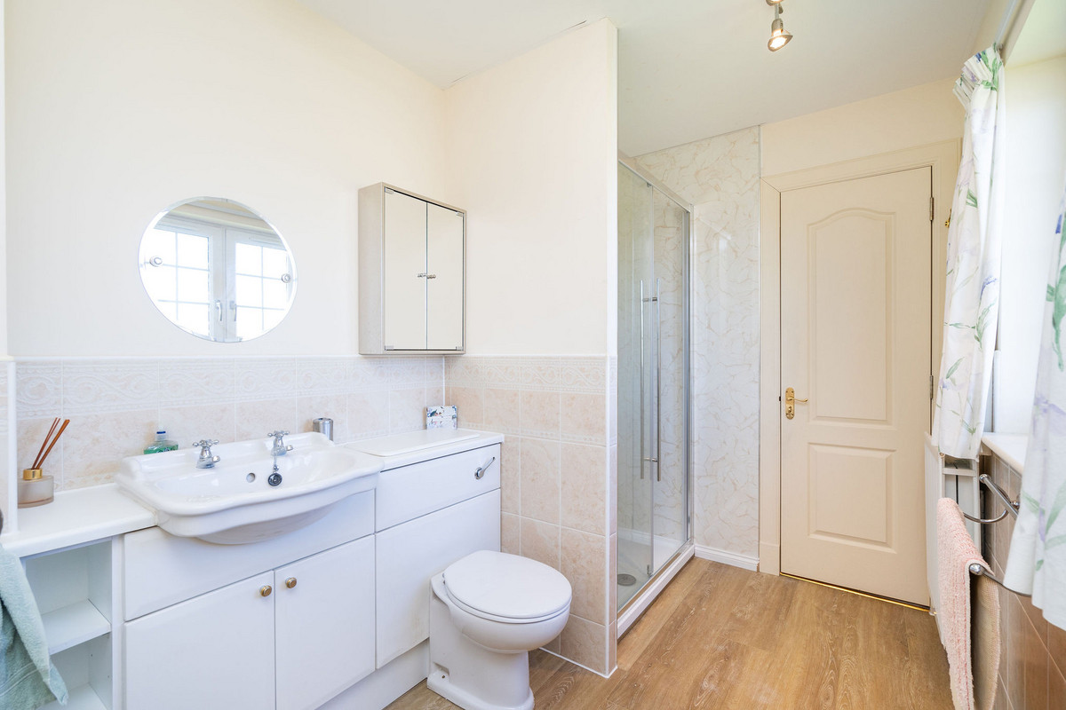 The principal double bedroom provides a peaceful retreat with built-in wardrobes and a stylish en-suite bathroom featuring a bath, separate shower enclosure, washbasin built into vanity, and a hidden cistern WC.