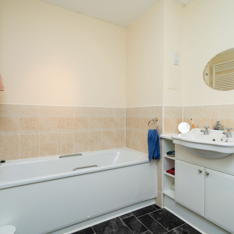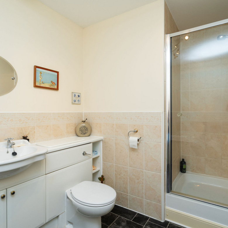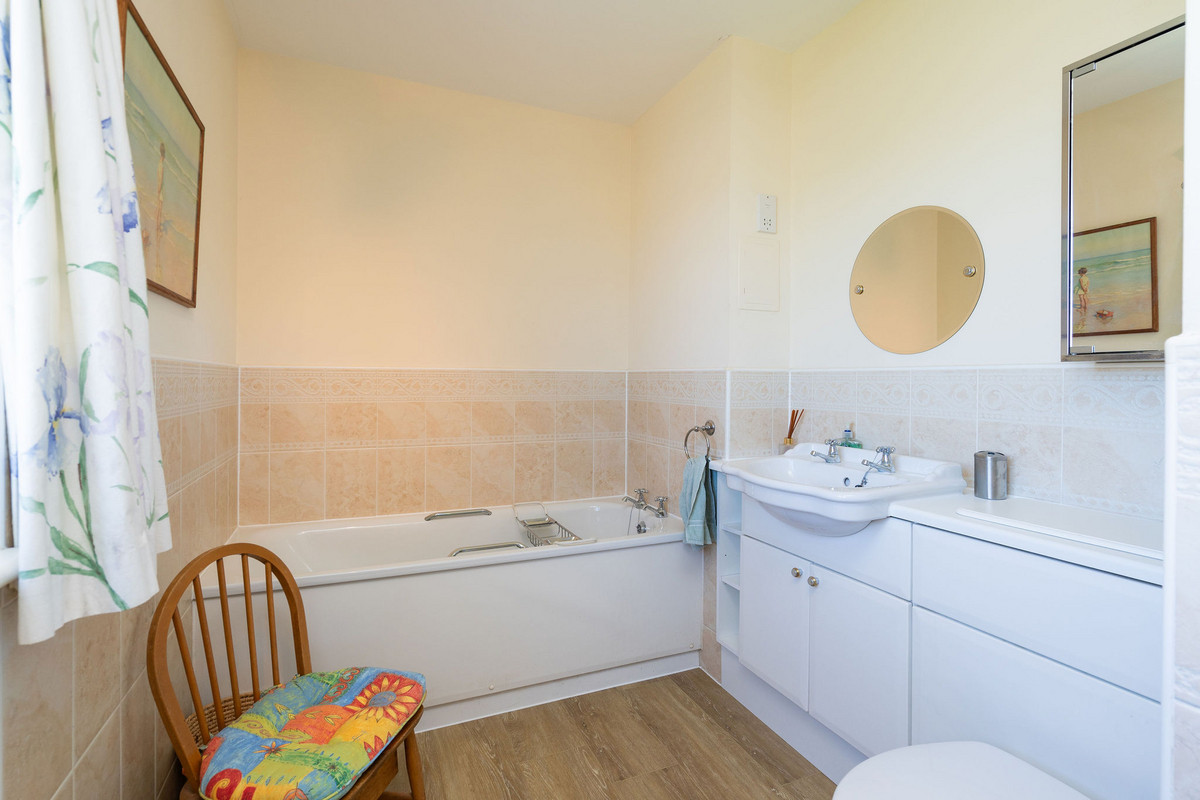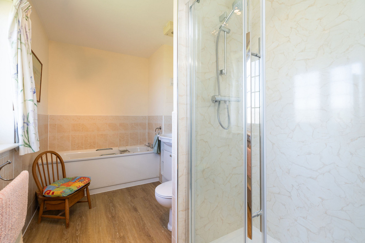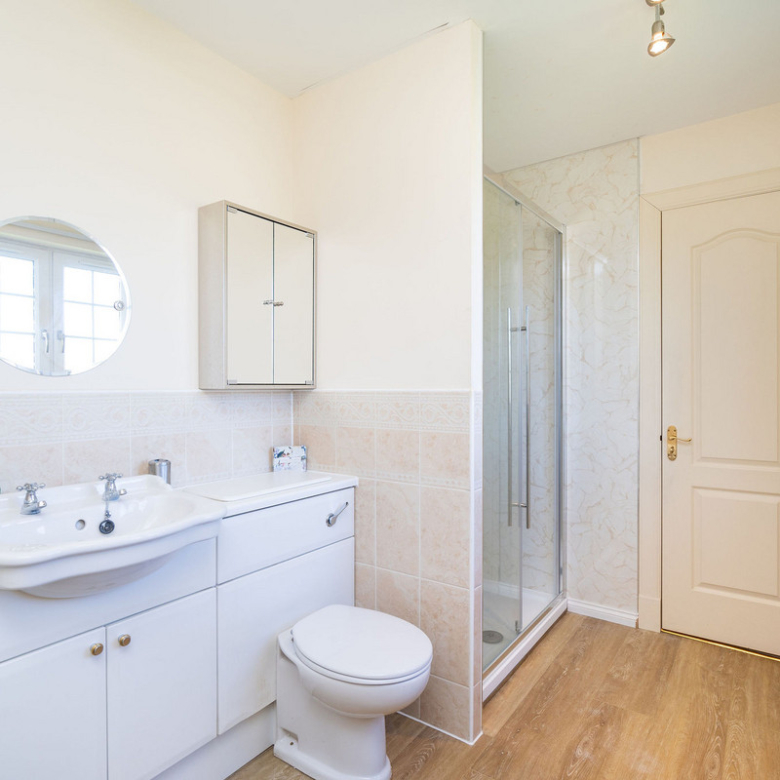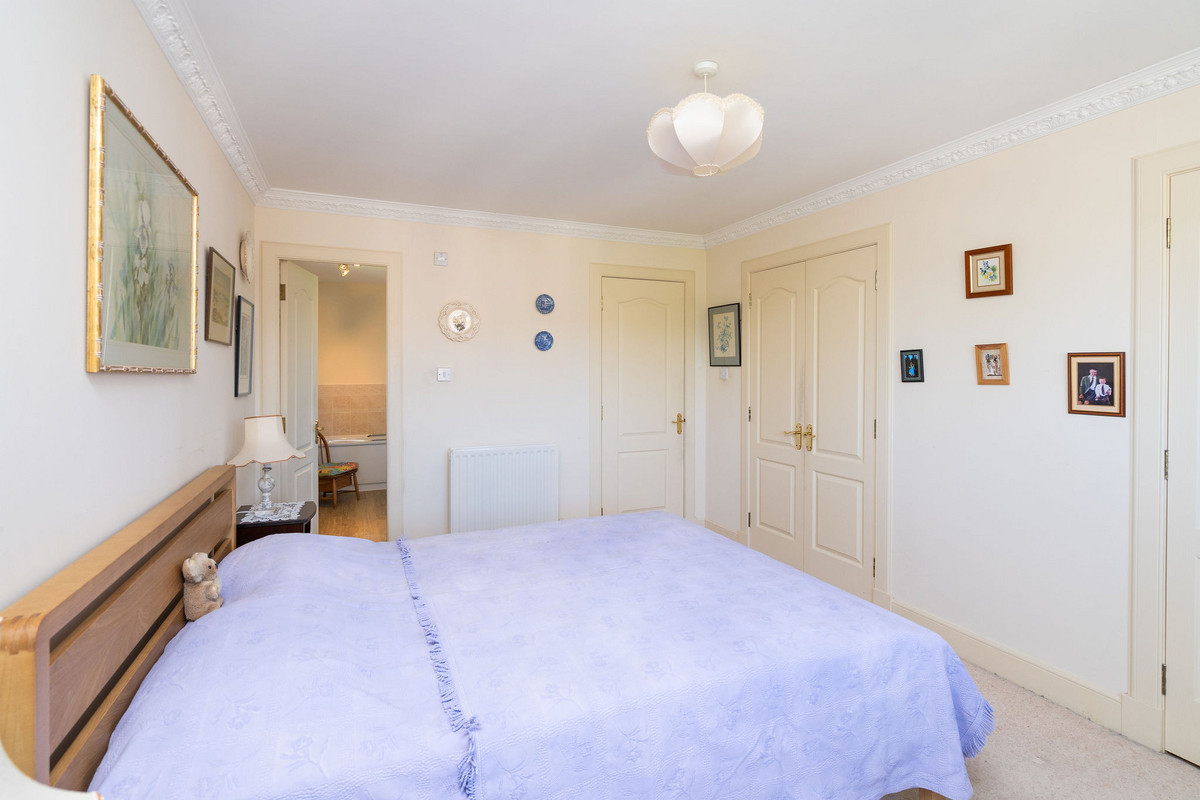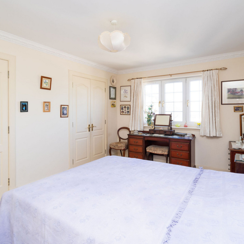 The principal double bedroom provides a peaceful retreat with built-in wardrobes and a stylish en-suite bathroom featuring a bath, separate shower enclosure, washbasin built into vanity, and a hidden cistern WC.