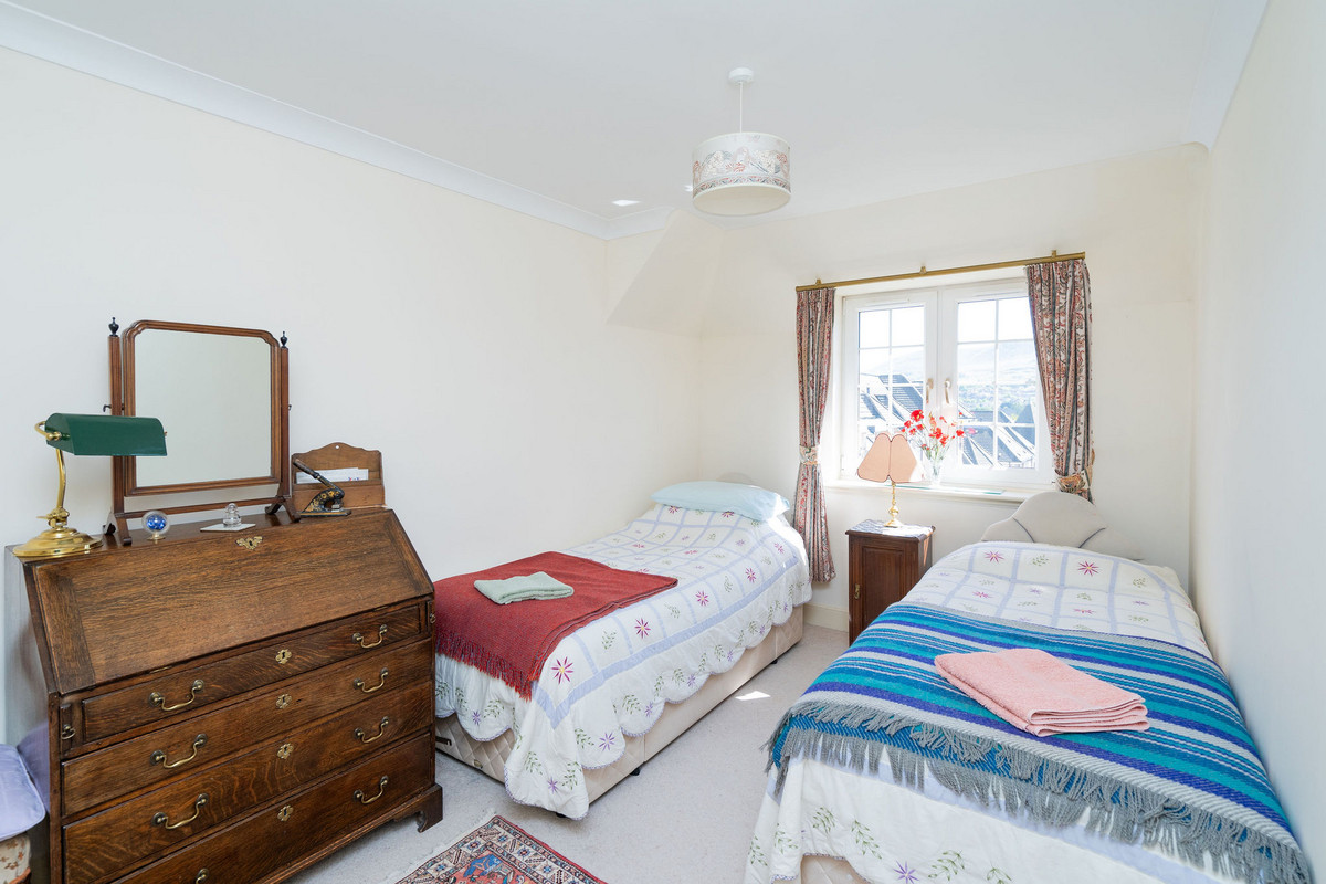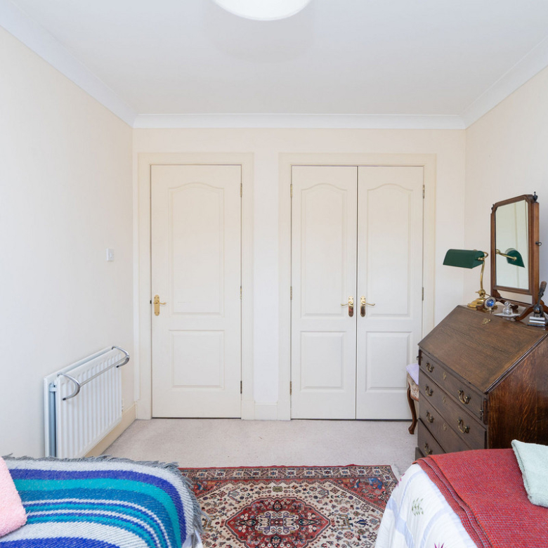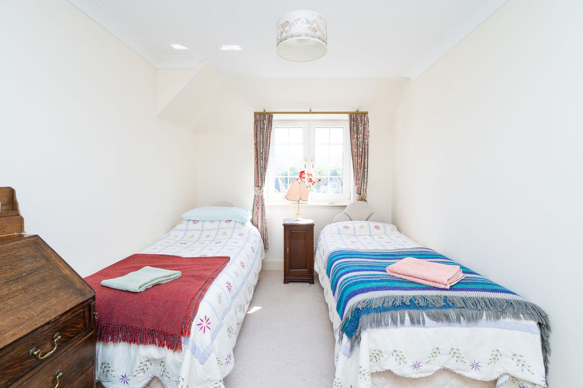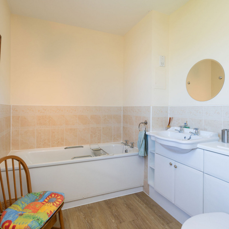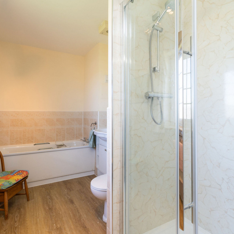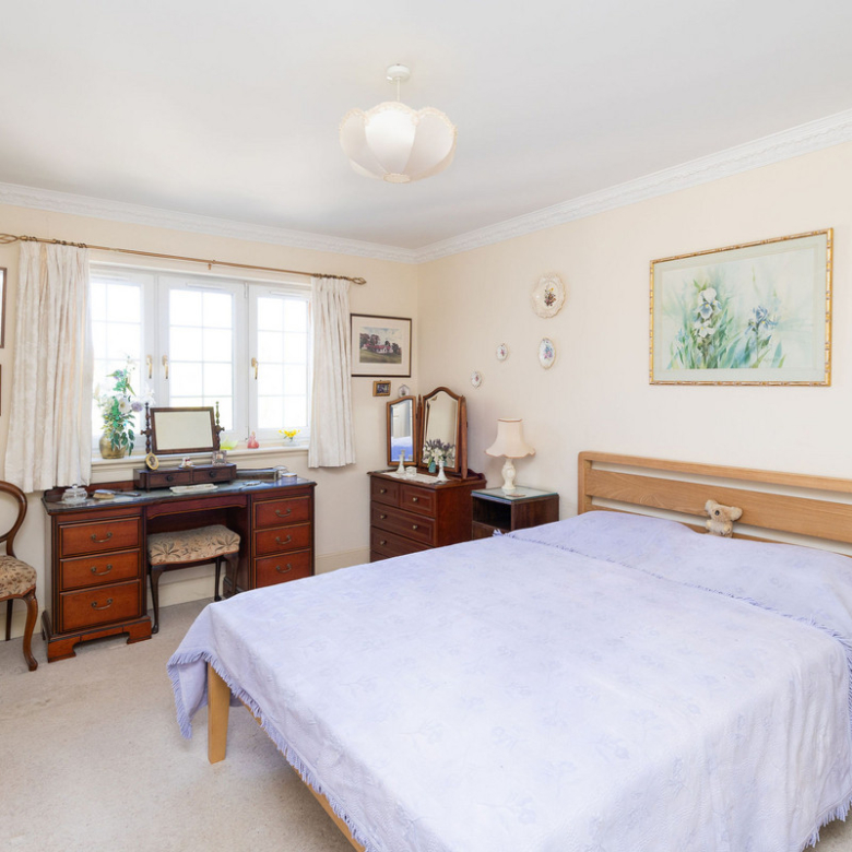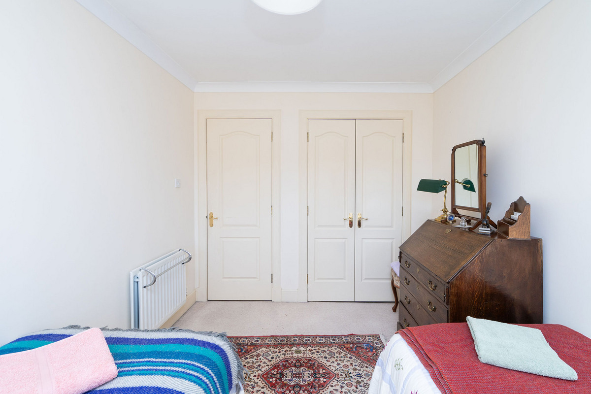 The principal double bedroom provides a peaceful retreat with built-in wardrobes and a stylish en-suite bathroom featuring a bath, separate shower enclosure, washbasin built into vanity, and a hidden cistern WC.
