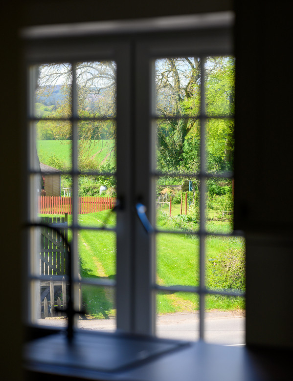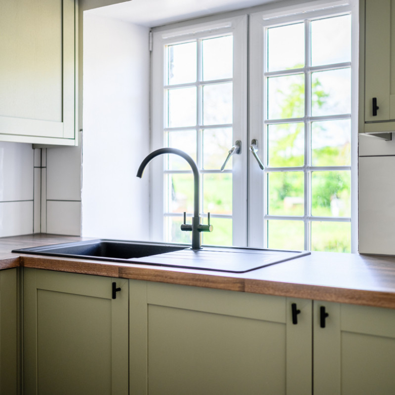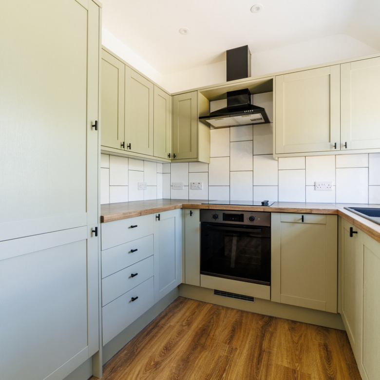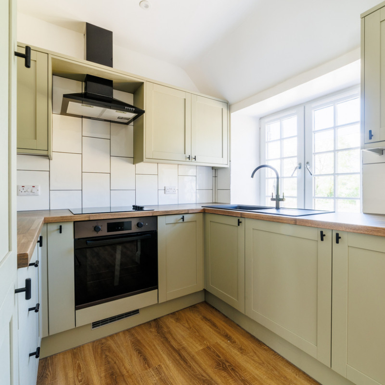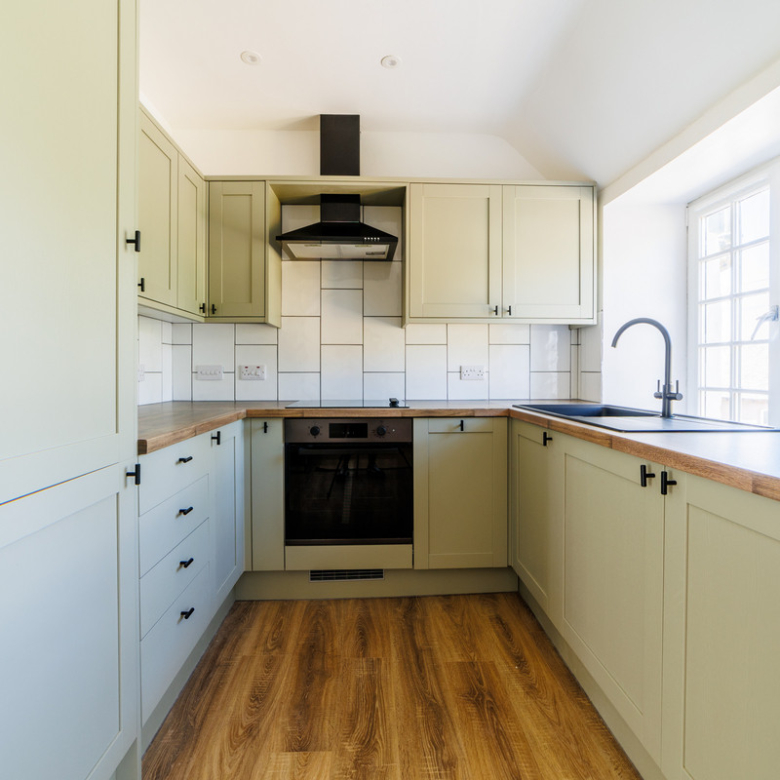 Adjoining the living room is a thoughtfully designed modern kitchen. Overlooking the rear garden, this bright space has soft green wall and floor units, butcher block style worktops, white splashback tiling, and integrated appliances including an extractor hood, electric hob, and oven.