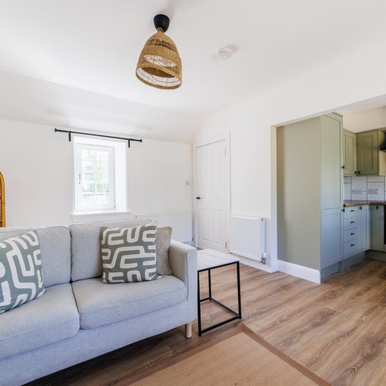 From here you come to the delightful dual east and west aspect living room. A comfortable and good-sized room that allows for dining, this is tastefully decorated with wood-inspired flooring finished in a natural tone.