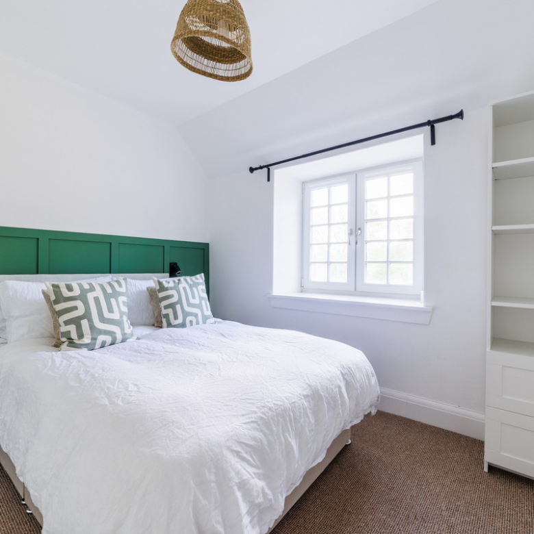 From here the light-filled south-facing double bedroom is peacefully situated with a delightful leafy rear aspect. The charming interior design includes wood-inspired flooring and a bespoke panel headboard finished in a tasteful sage green.