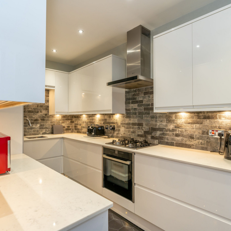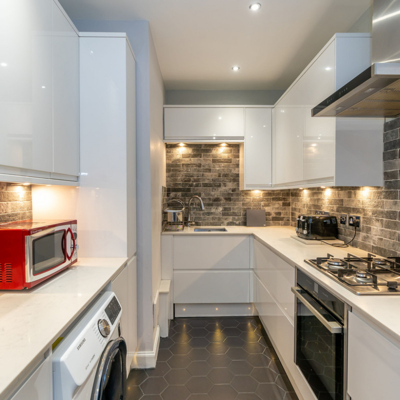A seamless flow leads you from the living room into the adjacent kitchen. Beautifully presented and contemporary in design, this exceptional space has sleek white handleless wall and floor storage, marble effect worktops, brick effect splashback, and plinth spotlights. Highly quality integrated appliances include a NEFF oven and hob.