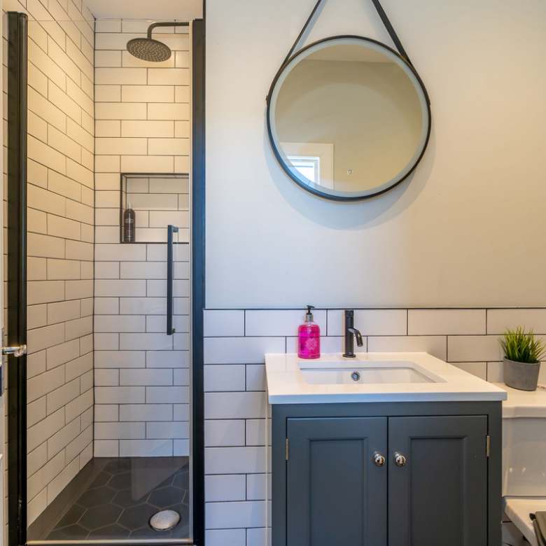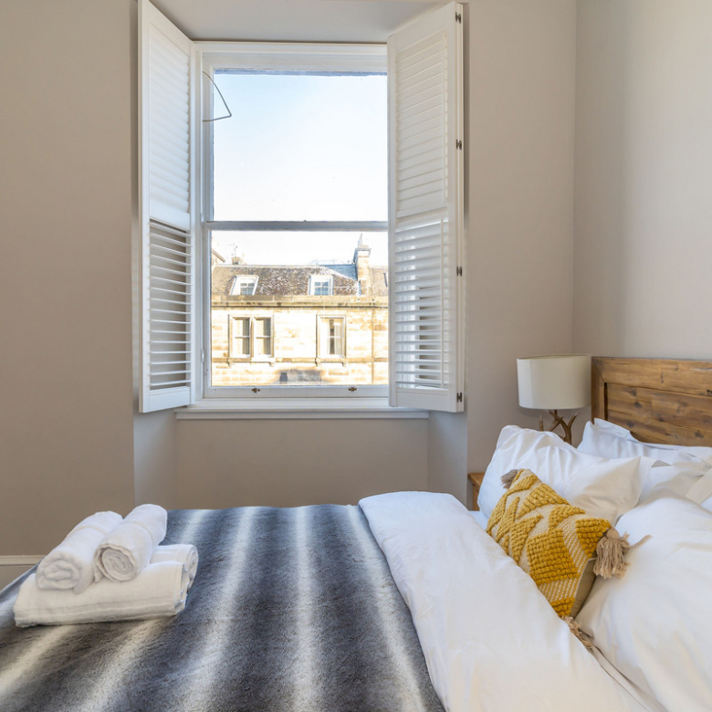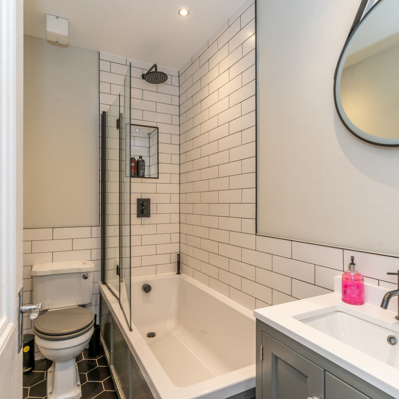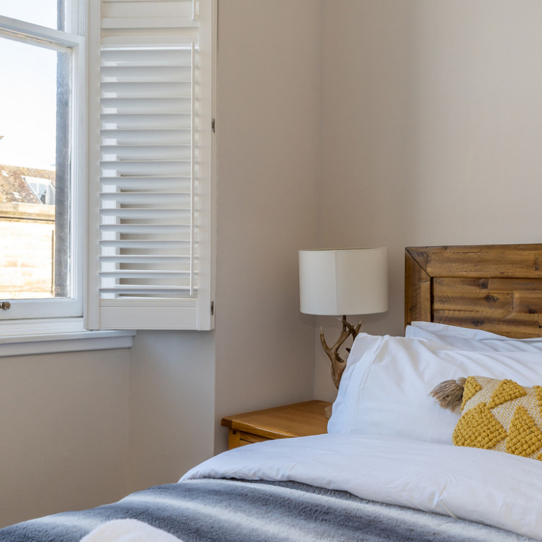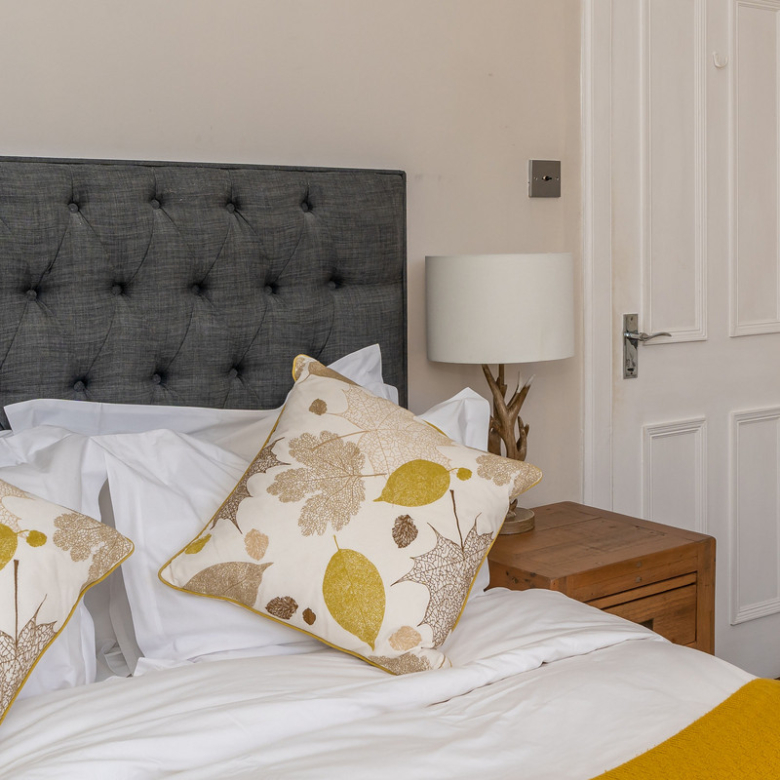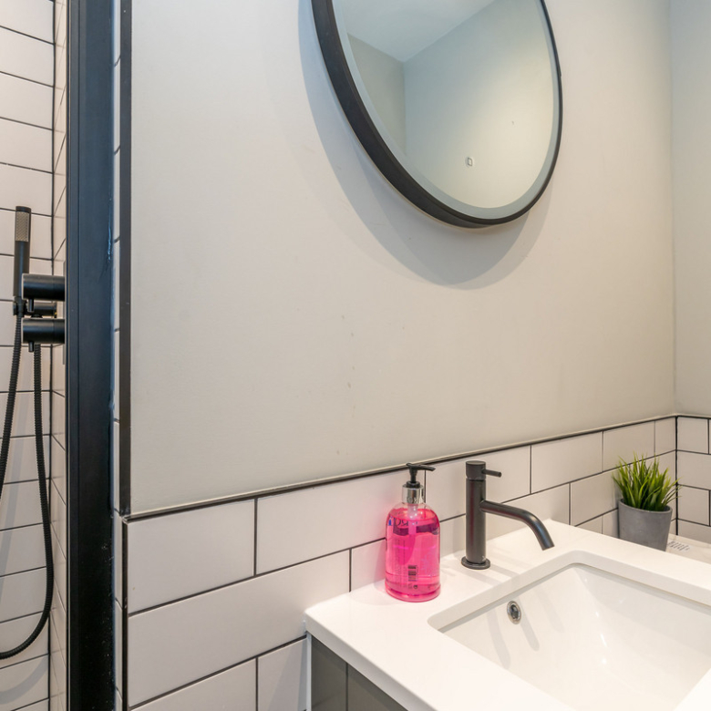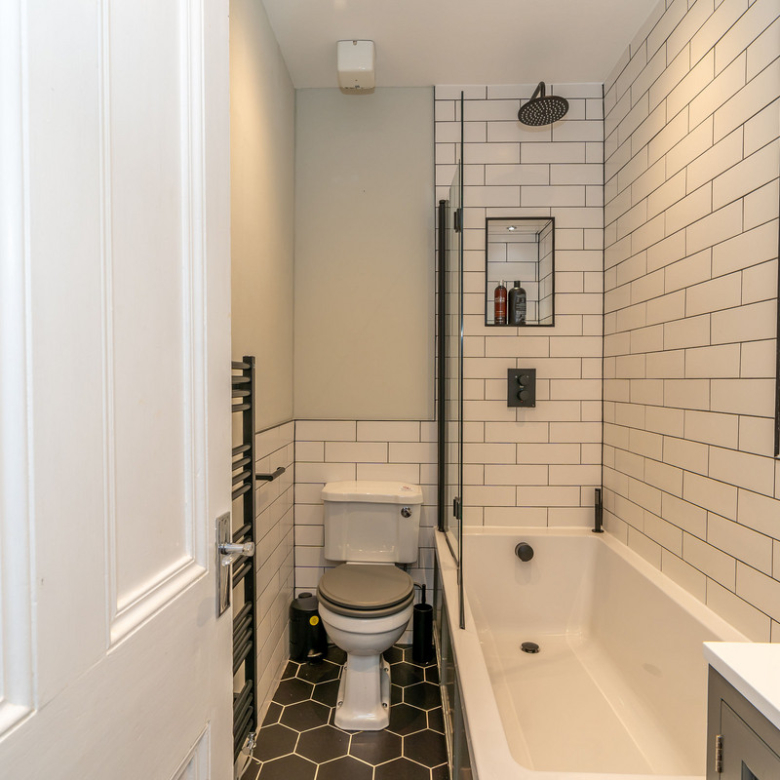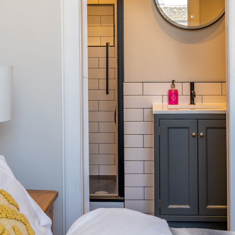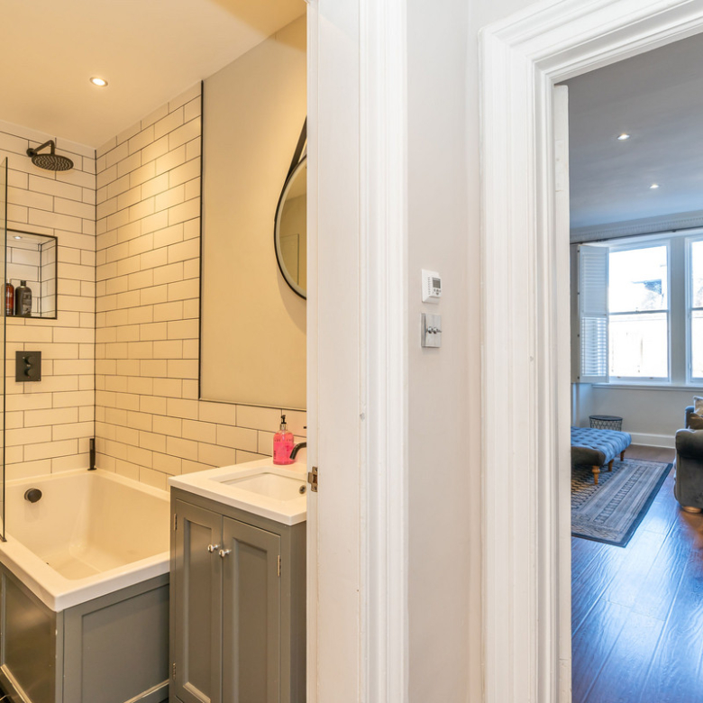 Opposite the kitchen lies the principal double bedroom. Simple yet elegant, it offers views across Manor Place and benefits from plentiful natural light giving a feeling of openness. An enviable walk-in shower room with a fresh modern design features an indulgent rain shower, WC, and washbasin built into storage.