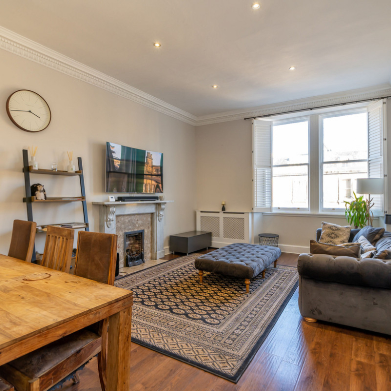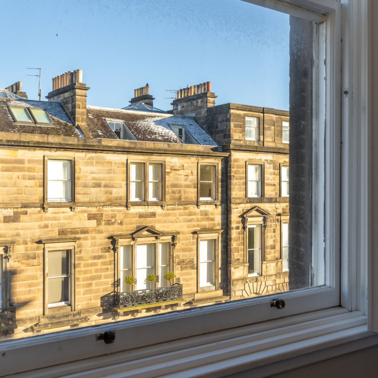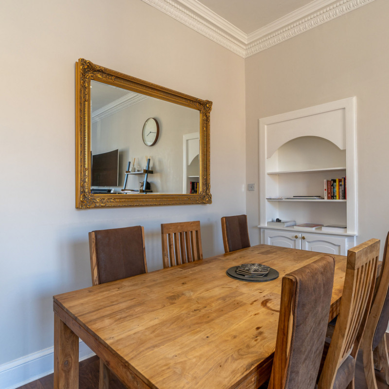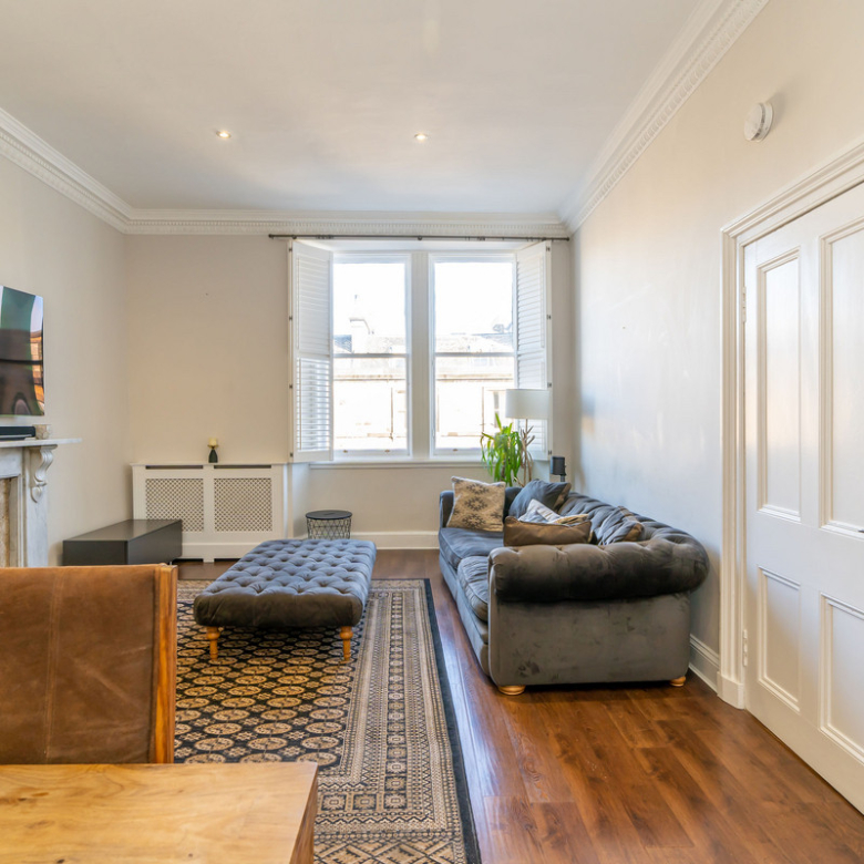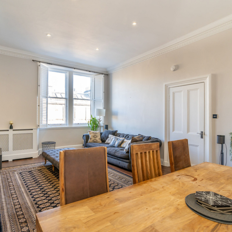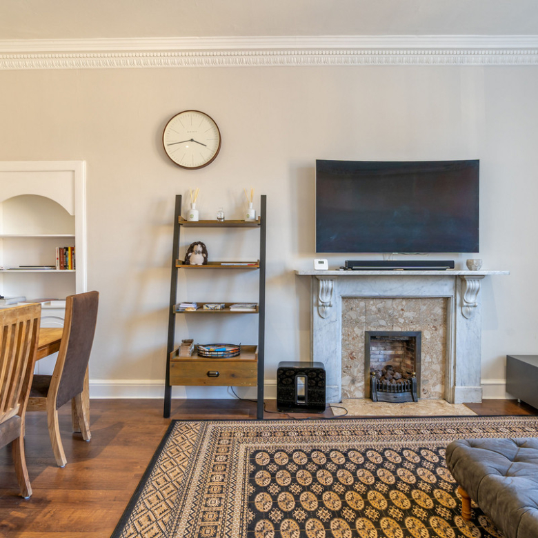 Accessed from a shared vestibule and sweeping staircase, the entrance hall of this elegant second-floor apartment leads you into a spectacular living room overlooking Manor Place. Full of natural light it is bright and spacious with a warm neutral décor and a wealth of period features, including a shelved Edinburgh press, ornate cornicing, and a focal marble fireplace.