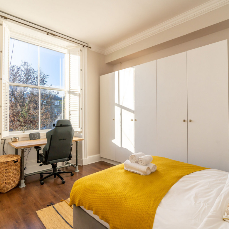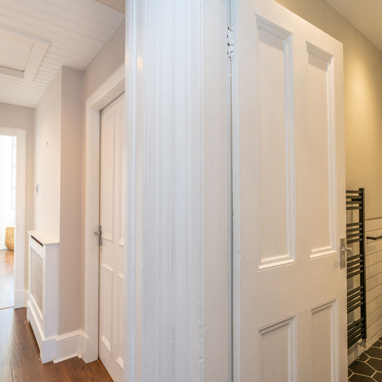 Across the hall is the second double bedroom. With views across the rear gardens this peaceful room has a sense of tranquillity enhanced by the warm neutral tones of the interior. It contains bespoke built-in wardrobes but offers ample space for freestanding furniture.