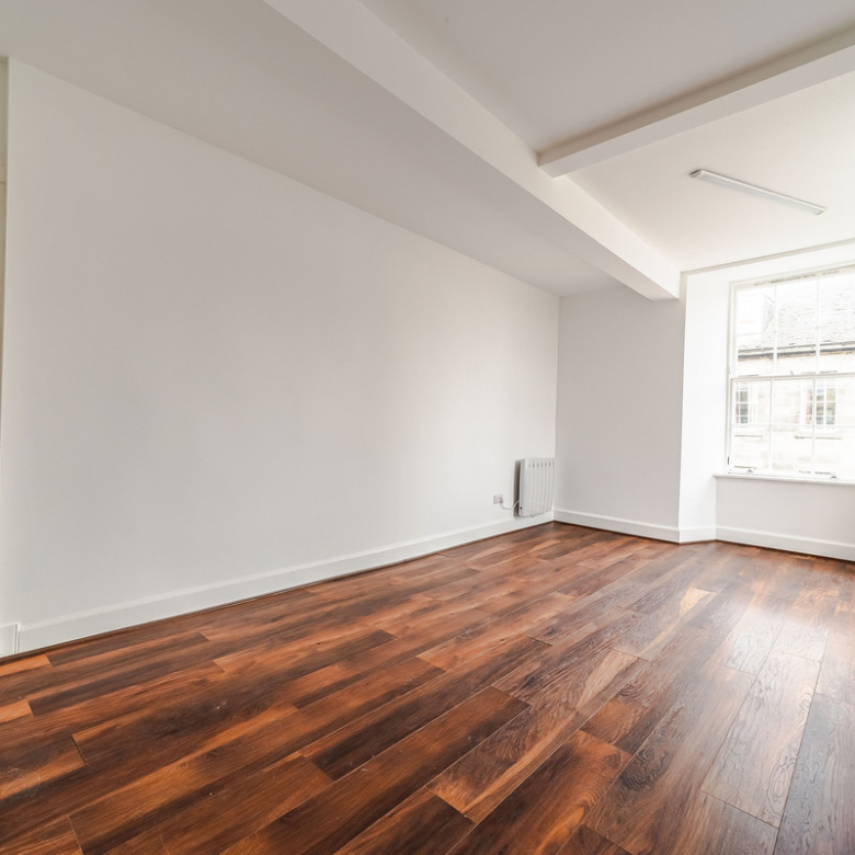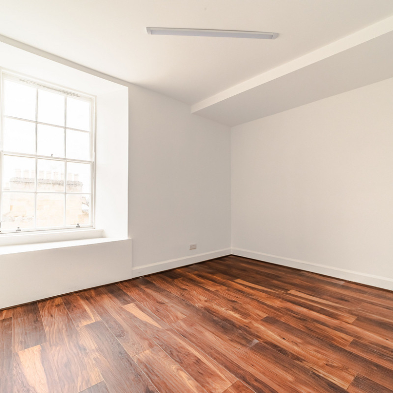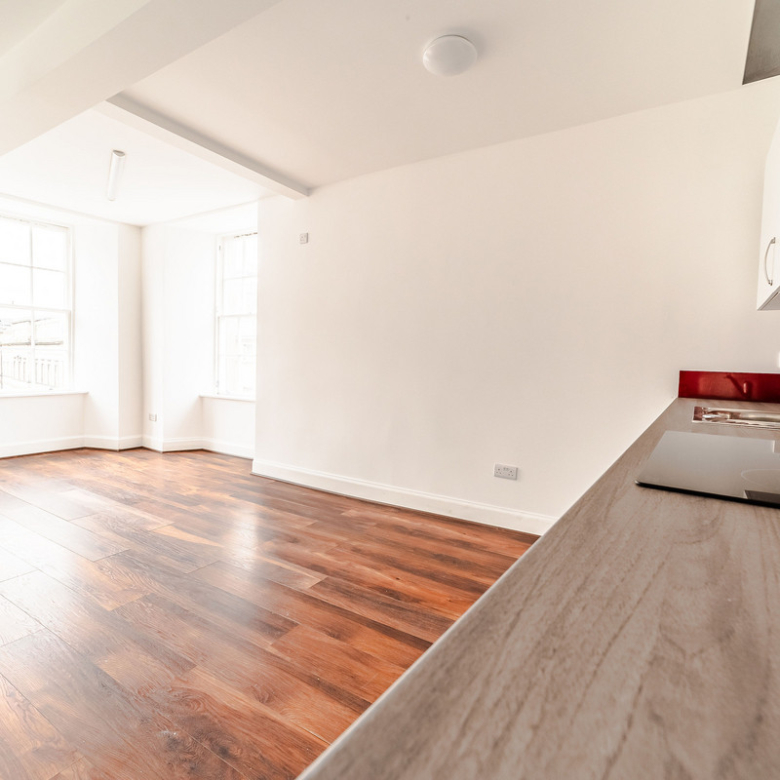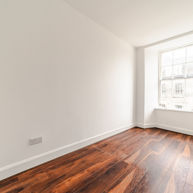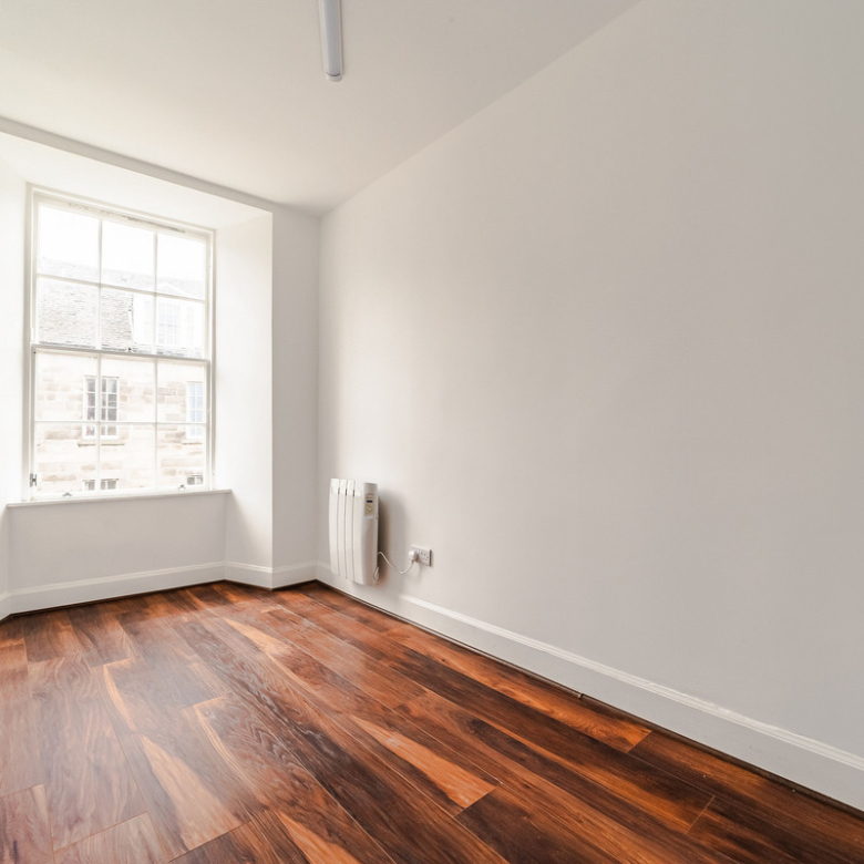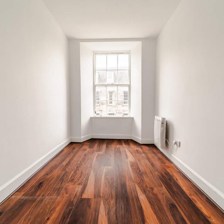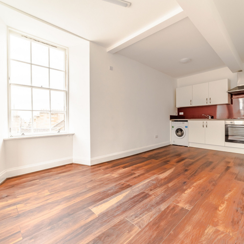 On the second floor, the front door opens into a welcoming hallway boasting a fresh crisp décor and polished hardwood flooring that runs throughout the property. From here you enter the spacious dining/living/kitchen. Flooded with natural light it enjoys a spectacular corner dual aspect with sash and case windows looking over to The University of Edinburgh’s 18th Century Old College, and its Sir Robert Rowand Anderson designed dome. The décor matches that of the hallway to give a seamless feel.