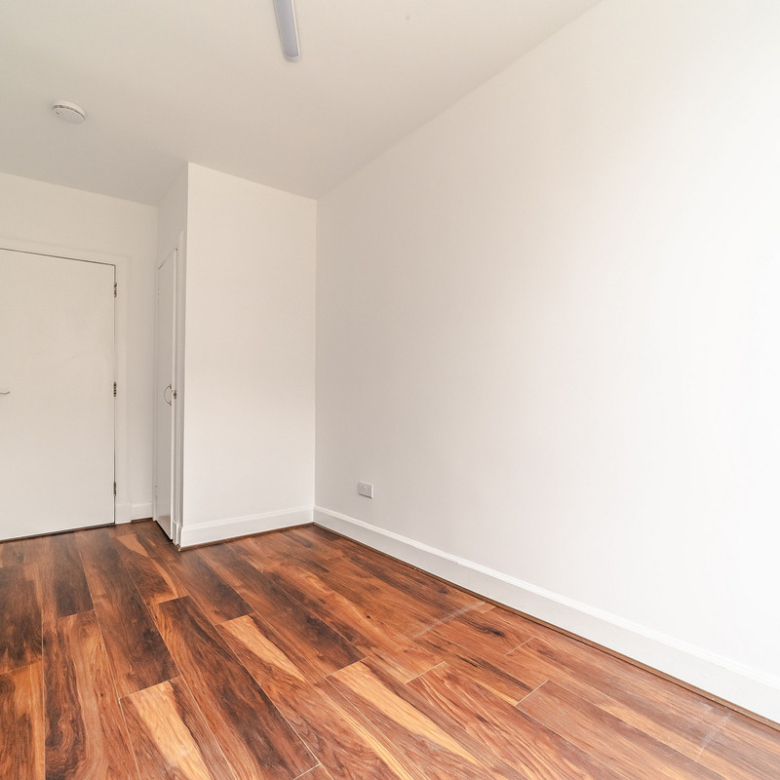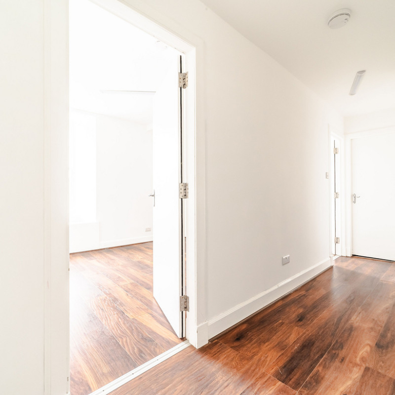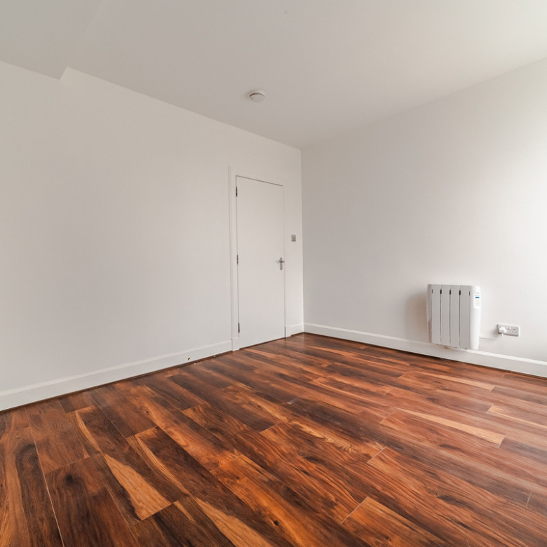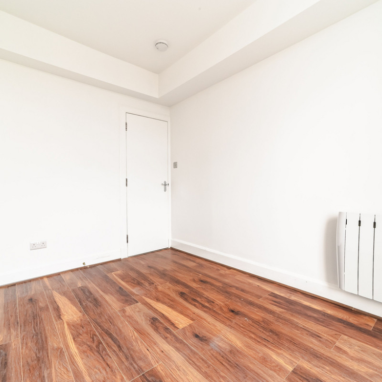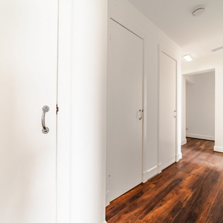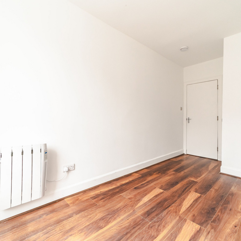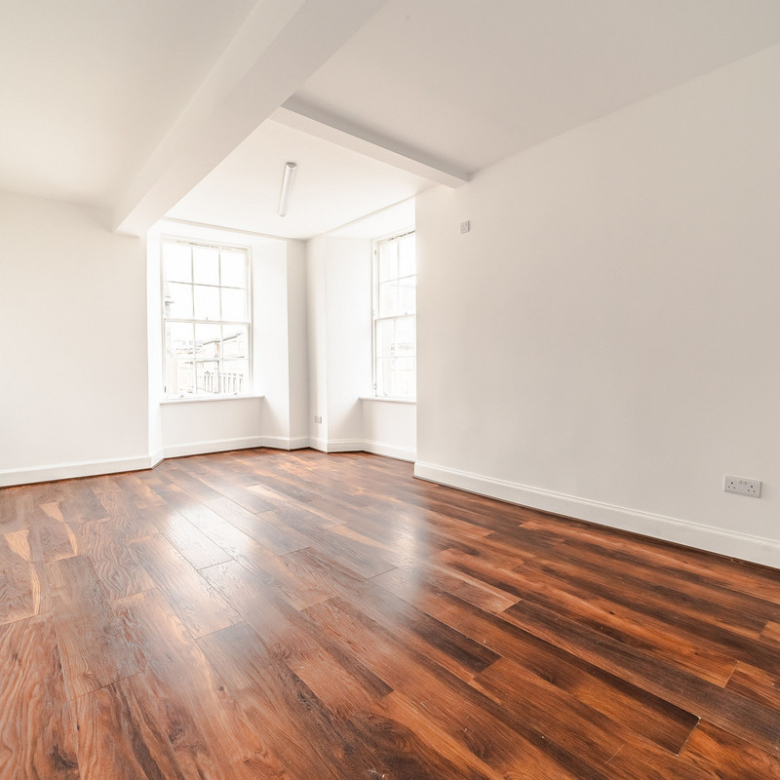 On the second floor, the front door opens into a welcoming hallway boasting a fresh crisp décor and polished hardwood flooring that runs throughout the property. From here you enter the spacious dining/living/kitchen. Flooded with natural light it enjoys a spectacular corner dual aspect with sash and case windows looking over to The University of Edinburgh’s 18th Century Old College, and its Sir Robert Rowand Anderson designed dome. The décor matches that of the hallway to give a seamless feel.