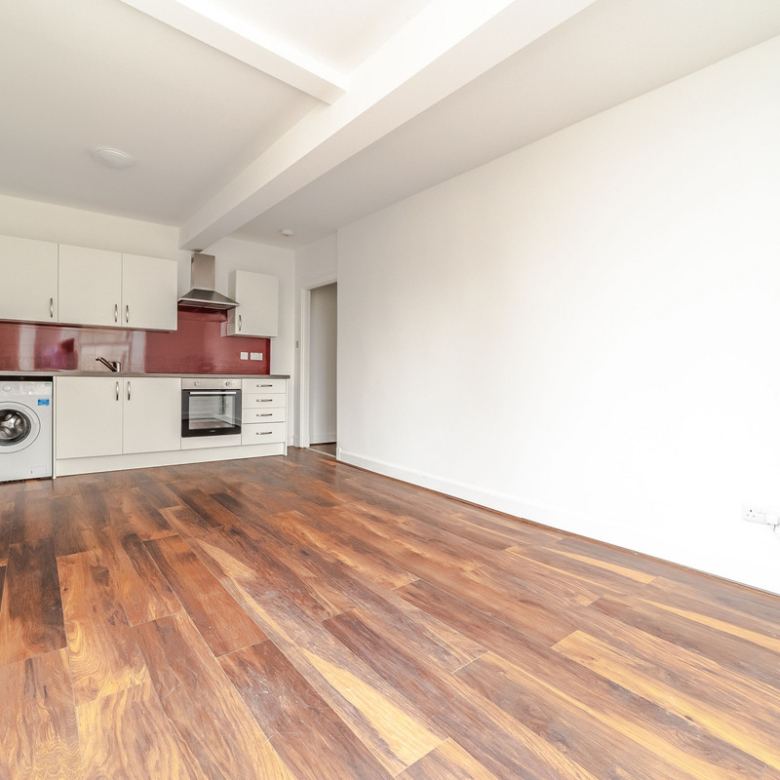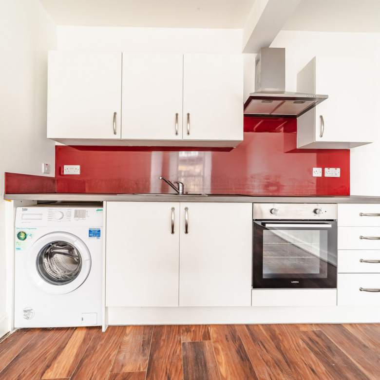 The contemporary one-wall kitchen is thoughtfully designed and comprises of white wall and floor units, light wood-effect worktops, and a red gloss acrylic splashback. Integrated appliances include an oven, hob, and stainless-steel extractor hood.