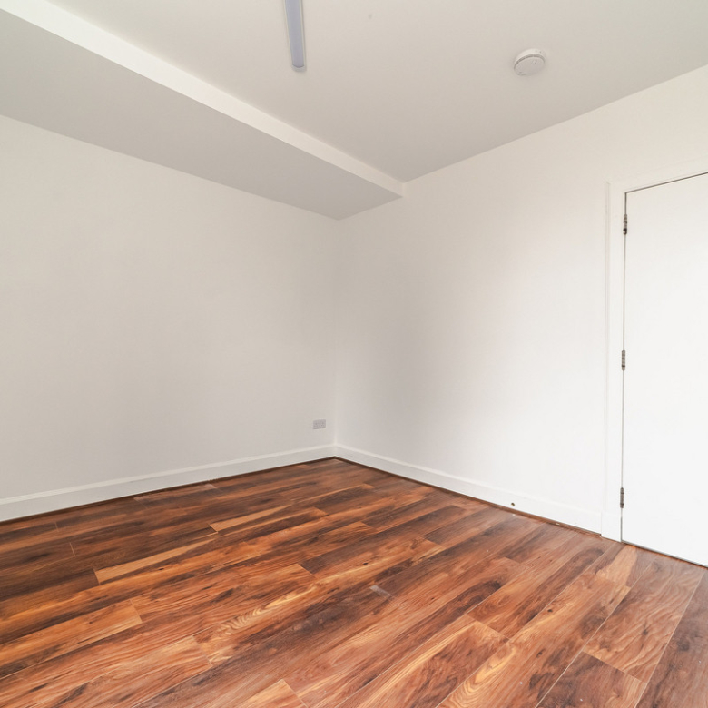 A modern bathroom completes the accommodation and features a three-piece white suite including a bath with a wall-mounted shower, WC, and washbasin.