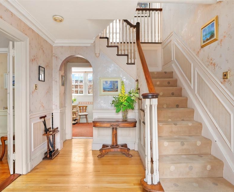 Upon entering, the home greets you with rich period charm, featuring solid American oak flooring, original timber sash windows, and an elegant centrepiece mahogany staircase that anchors the property’s interior character. The ground floor is beautifully arranged to suit modern family life and entertaining alike, with a formal dining room and adjoining kitchen/dining room on the left-hand side. To the right, a spacious living room leads seamlessly into a bright sunroom, offering an ideal retreat throughout the day. To the rear of the home, a ground-floor bathroom and an external door provide direct access to the garden and patio area.