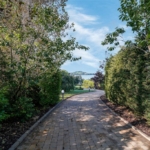 The house is approached via a long, tree-lined avenue that opens onto a generous forecourt at the front of the property. The symmetrical façade is framed by a refined stone porch with double doors, consistent with the elegance and proportions typical of Georgian architecture.