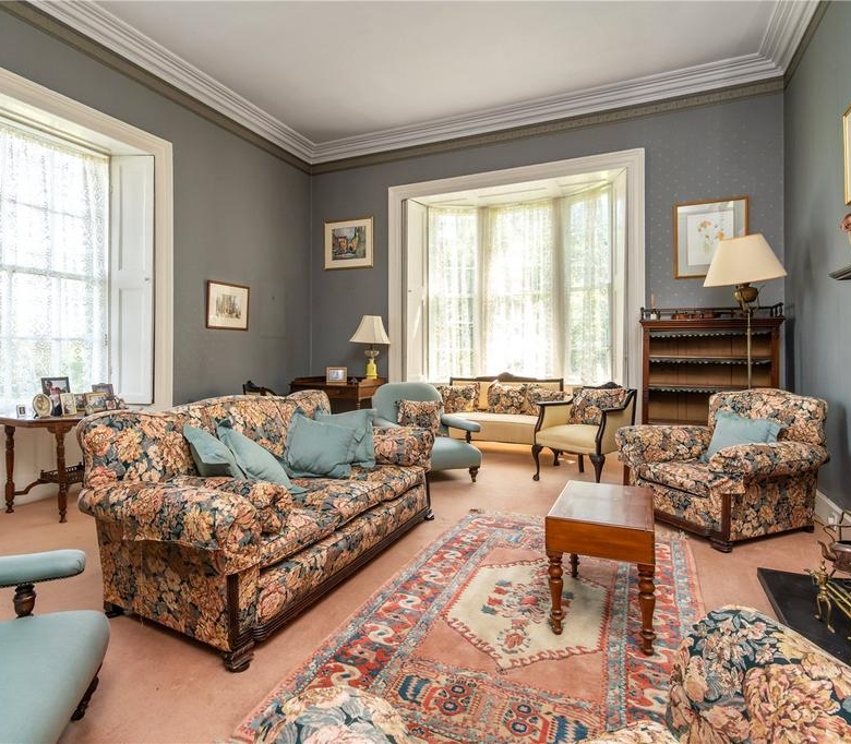 The entrance porch leads into a wide central hall, which gives access to both the formal drawing room and the sitting room. The sitting room features a classic fireplace, while the drawing room is particularly notable for its bay windows and an ornate period fireplace, ideal spaces for both entertaining and everyday family life.