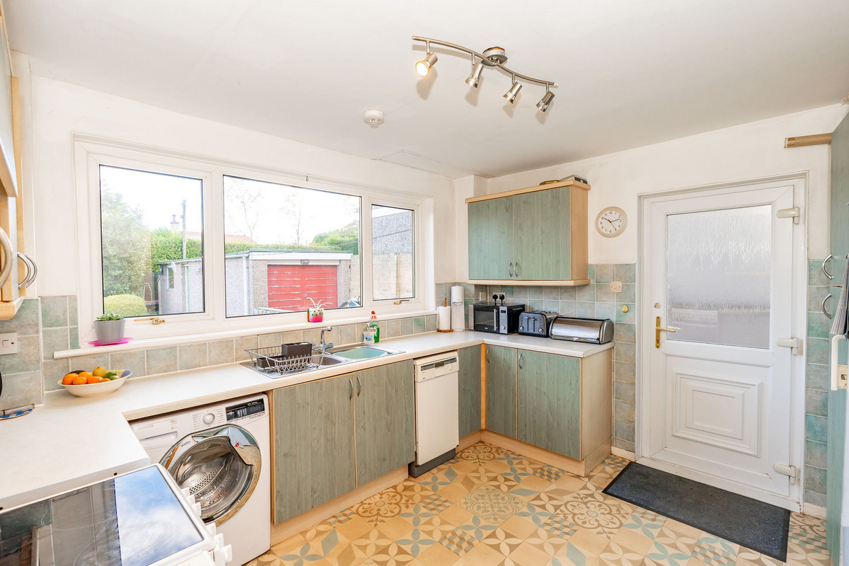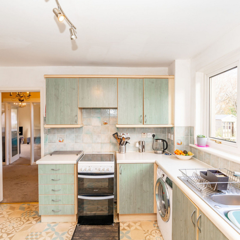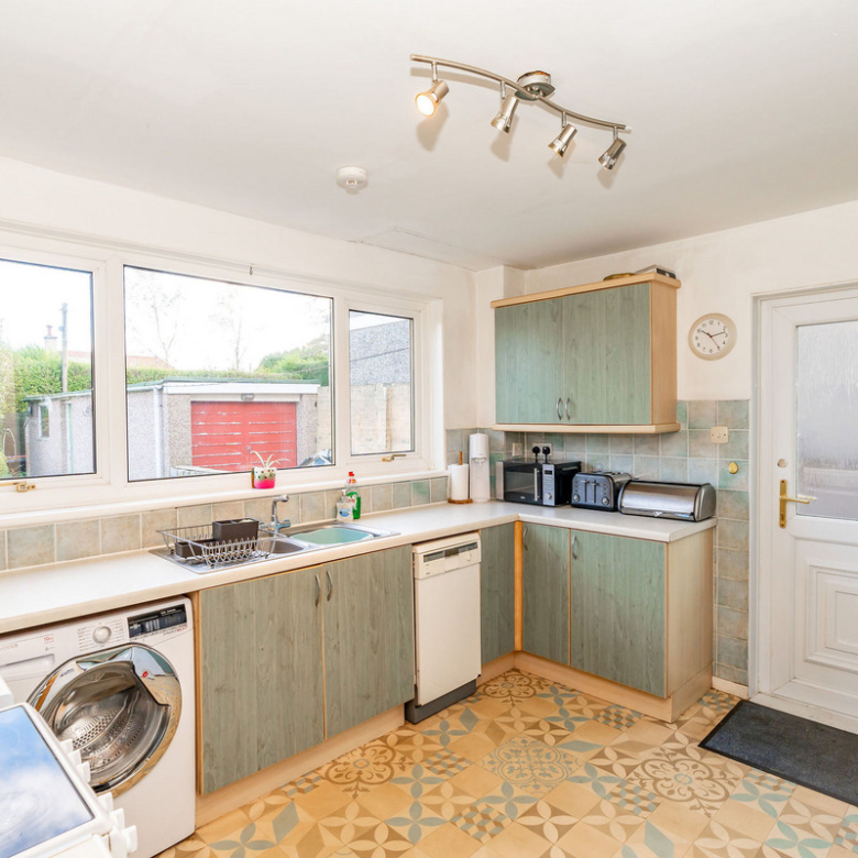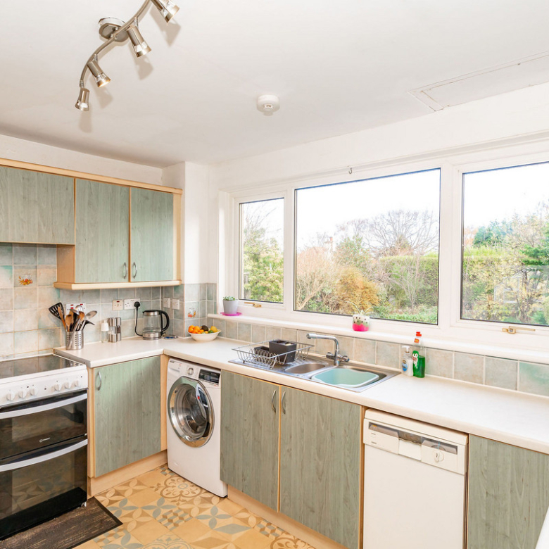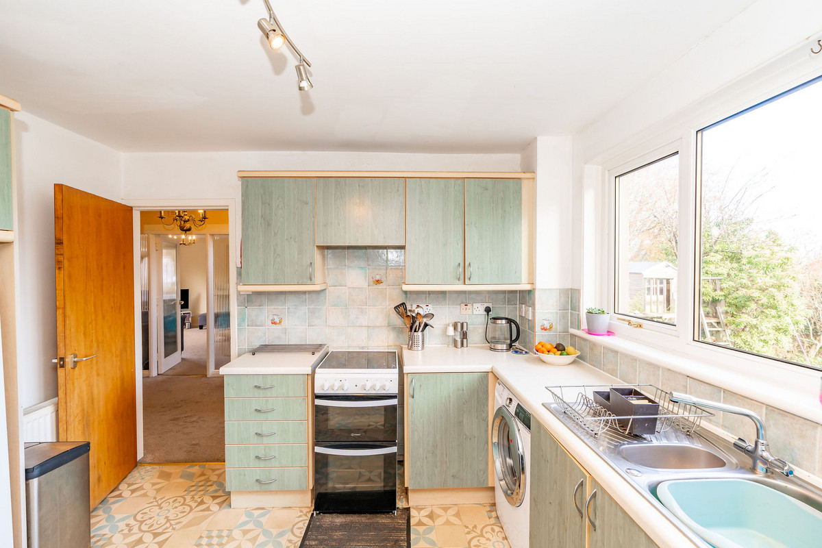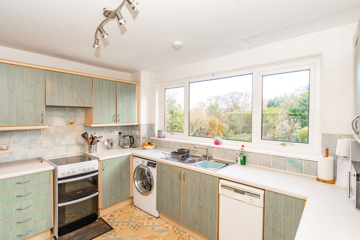 Across the hallway, the modern kitchen enjoying a peaceful aspect of the rear garden along with access boasts ample wall and floor units, worktops a tiled splashback, and space for freestanding appliances. Its u-shaped layout and easterly outlook ensure that it feels light and airy.
