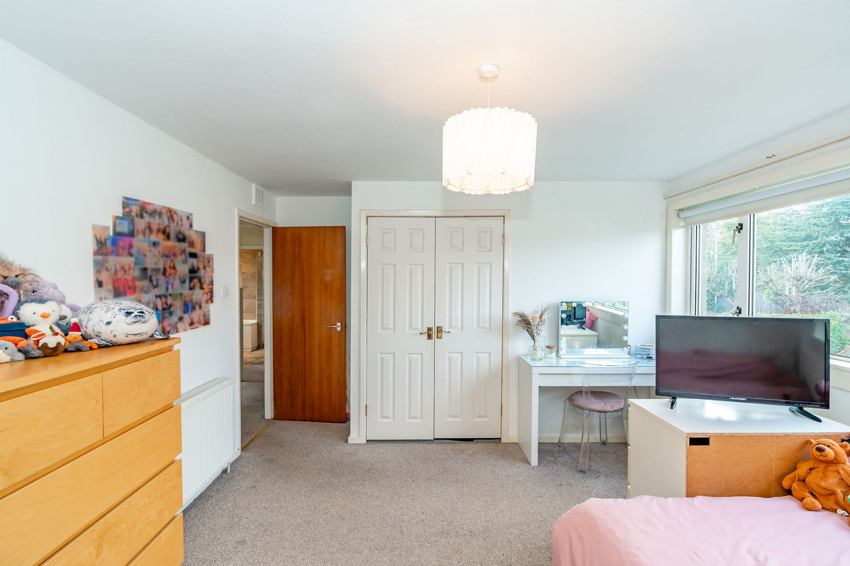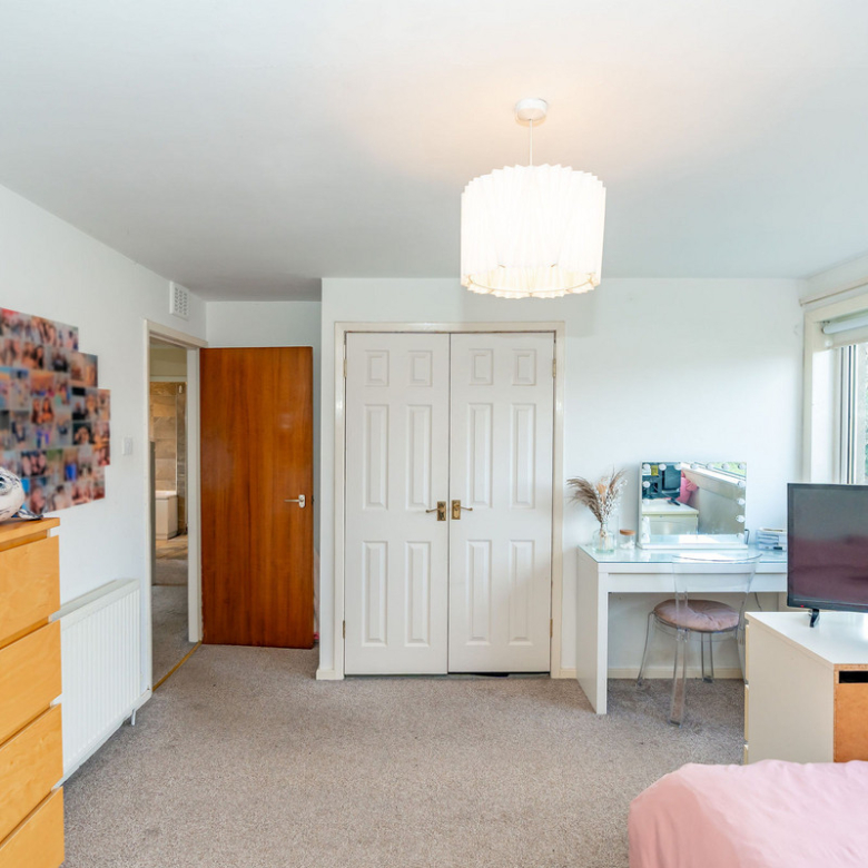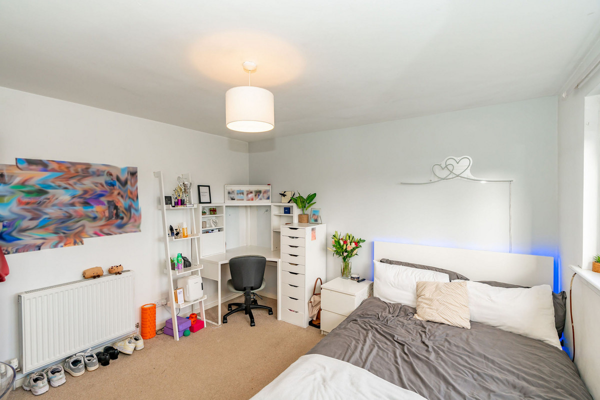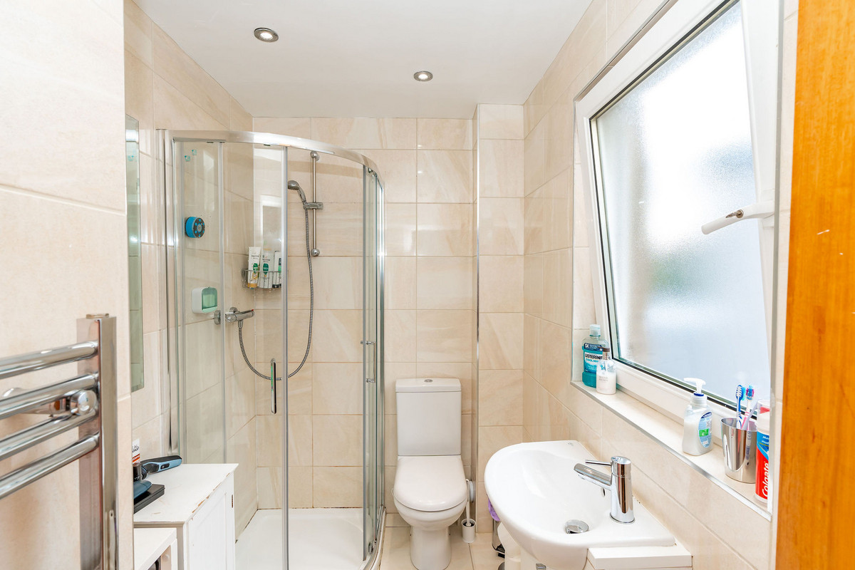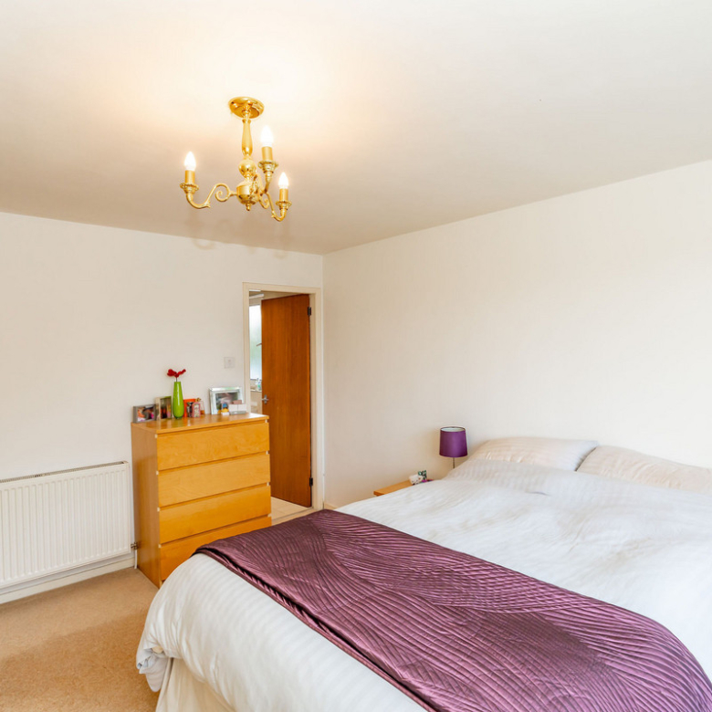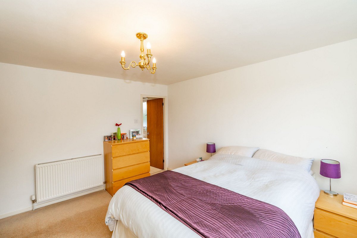 The west-facing principal double bedroom is a relaxing space that benefits from a stylish modern en-suite shower room complete with a chrome towel radiator, WC, and washbasin.