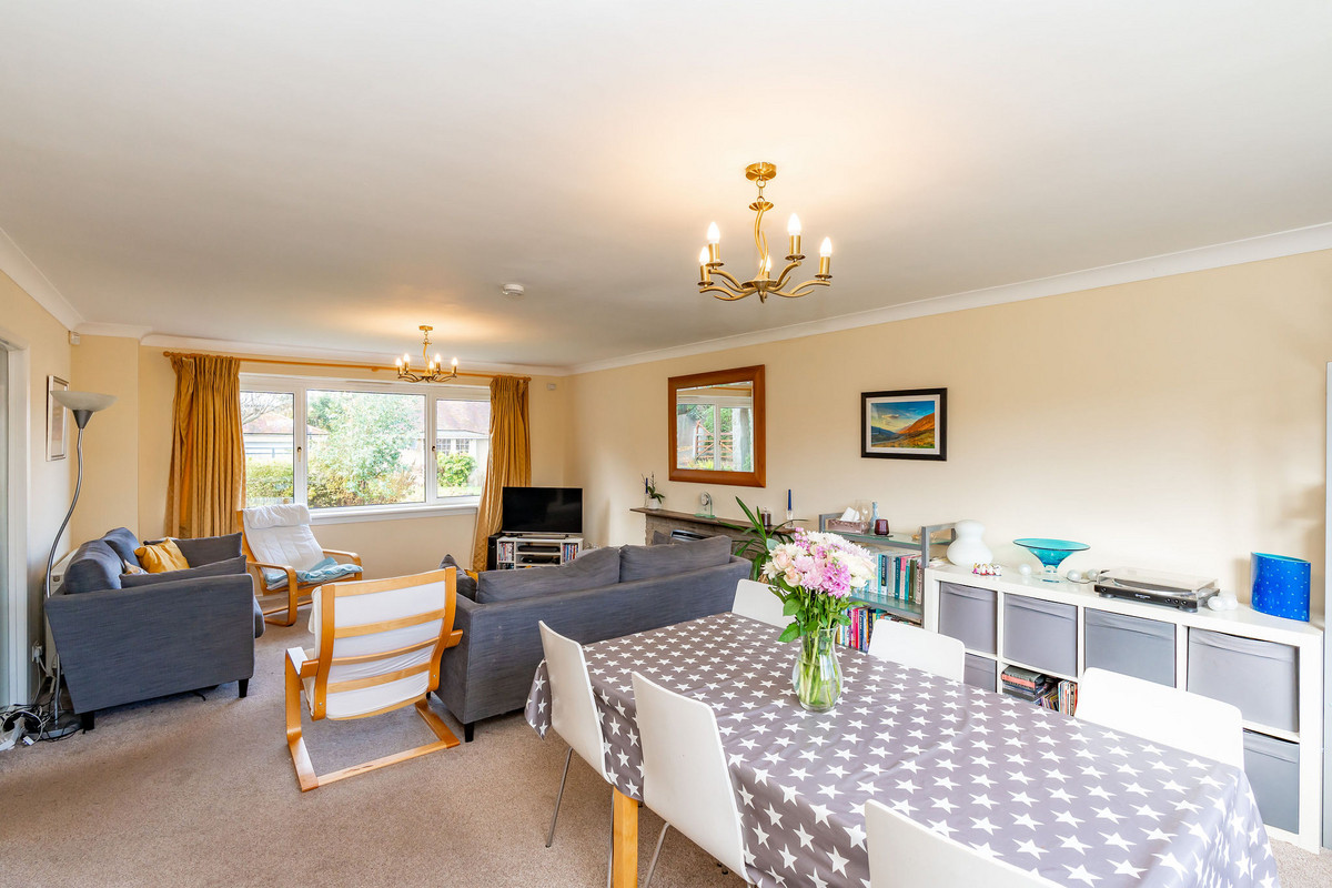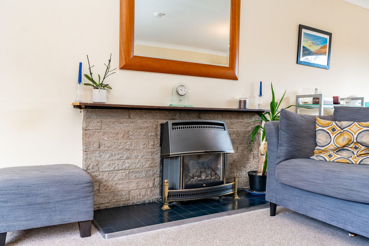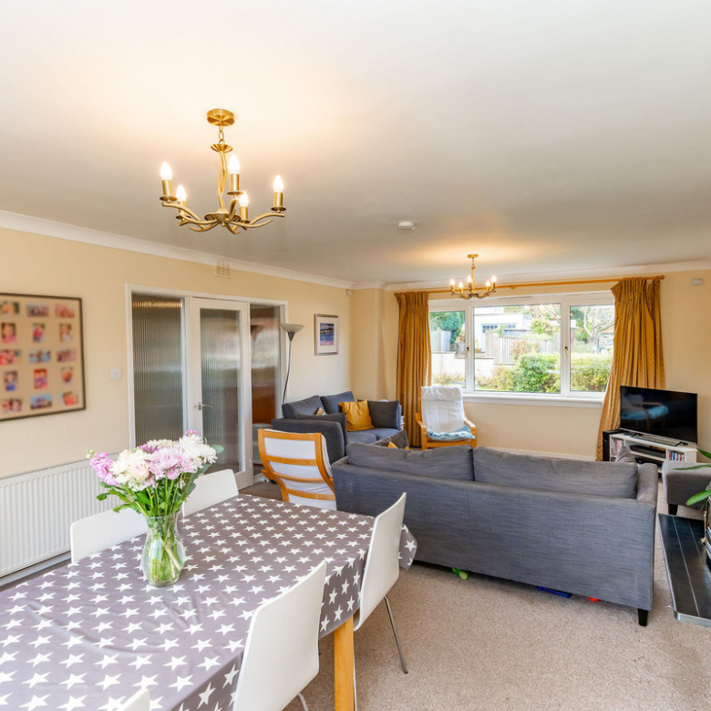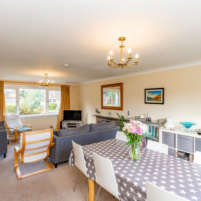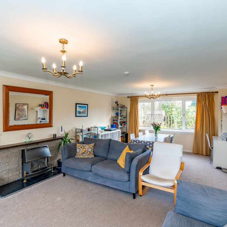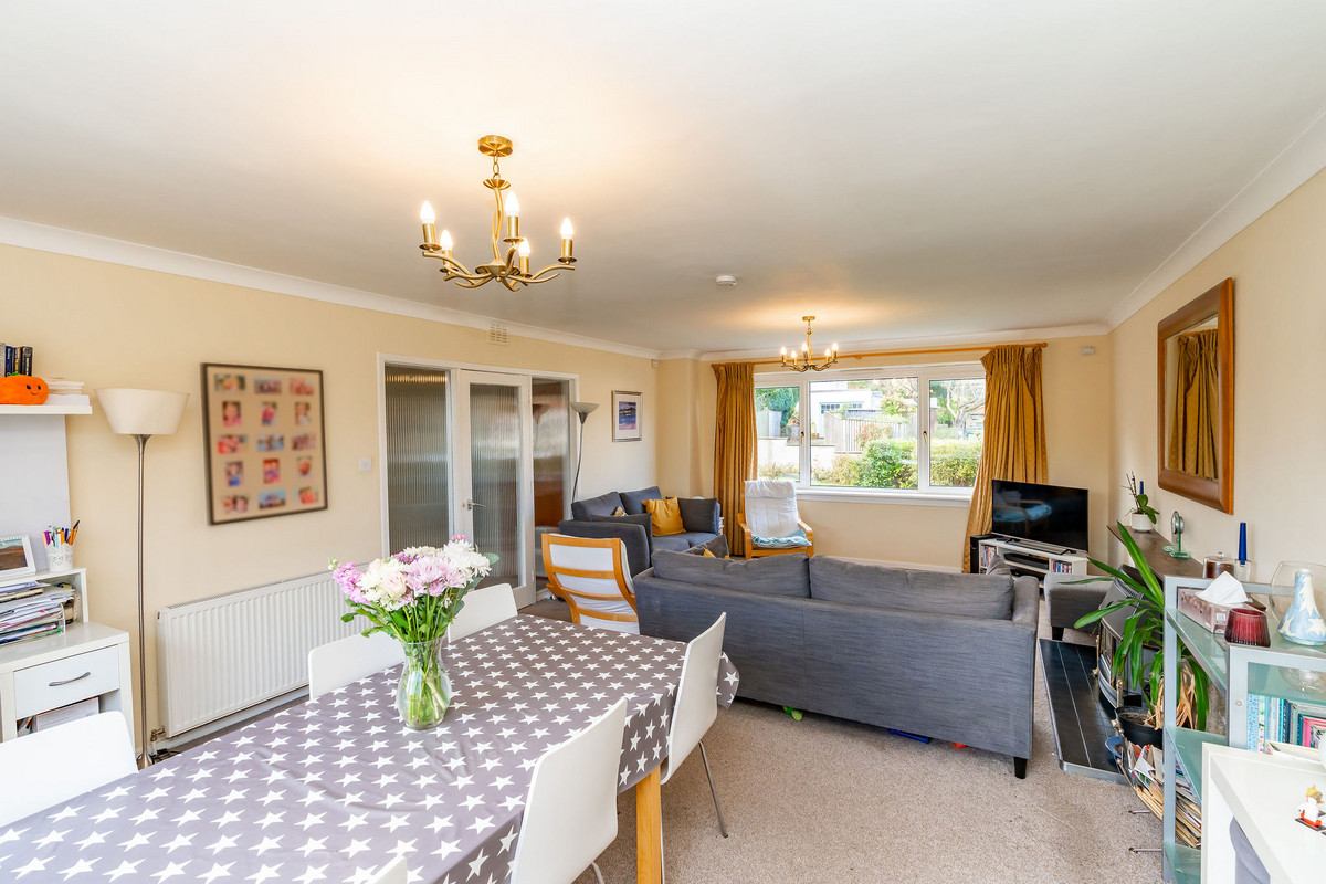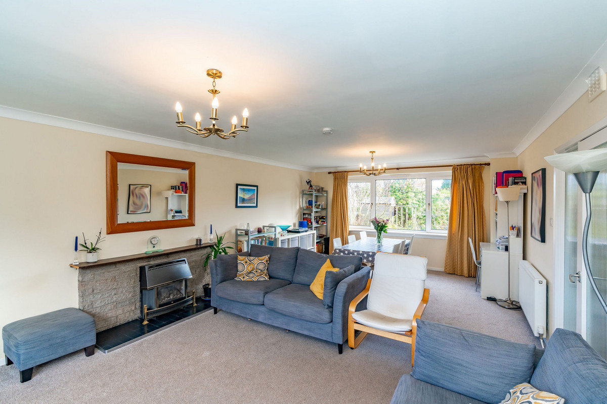 To your left and entered through fully glazed doors is a light-filled dual-aspect open plan dining/living room overlooking both the front and rear gardens. Carpeted and decorated in warm neutral tones it exudes a feeling of warmth and comfort, further enhanced by the living flame fireplace. Its generous proportions allow for a variety of furniture configurations specific to individual needs.