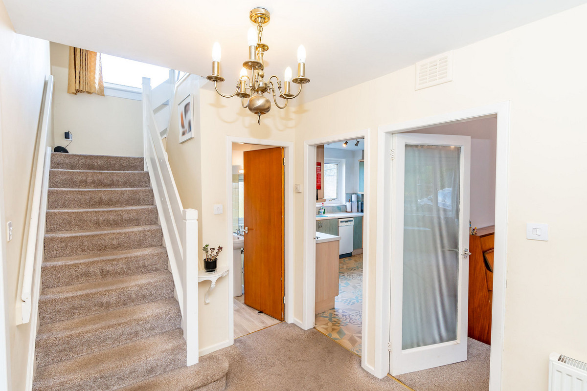 Approached via a gated driveway leading to the garage and flanking a neat west-facing lawn, the front door opens into a carpeted and tastefully decorated hallway.