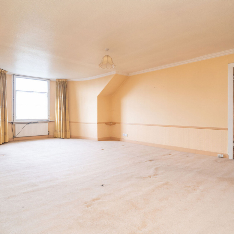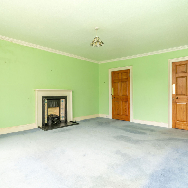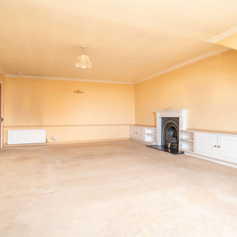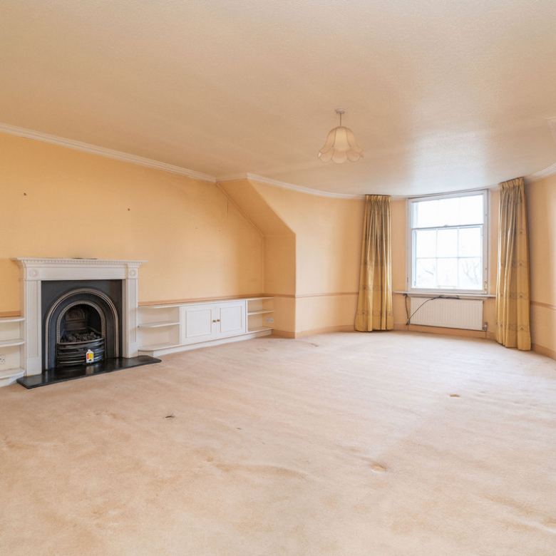 Showcasing grand proportions and high ceilings, the light-filled and bow-ended living room exudes a wonderful feeling of openness. Tastefully decorated it is adorned with carpeting, a soft colour palette, and a cast iron fireplace.