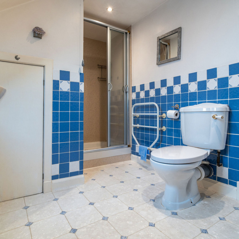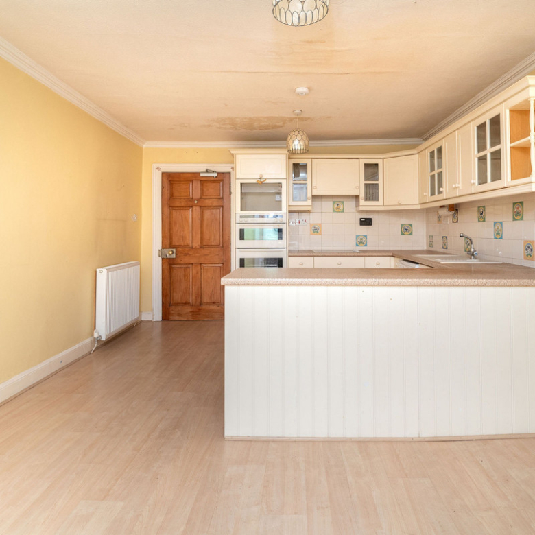 Diagonally across the hallway, the south-facing kitchen features a U-shaped design to maximise the layout and allow for comfortable dining. Cream wall and floor units are paired with a tiled splashback and worktops. Integrated appliances include an eye-level grill, oven, induction hob, and extractor hood.