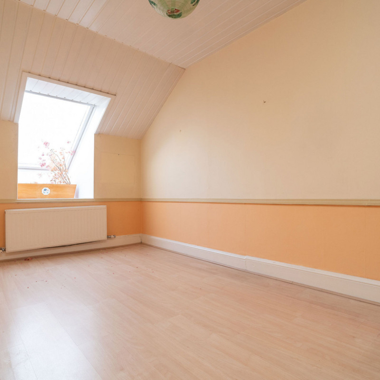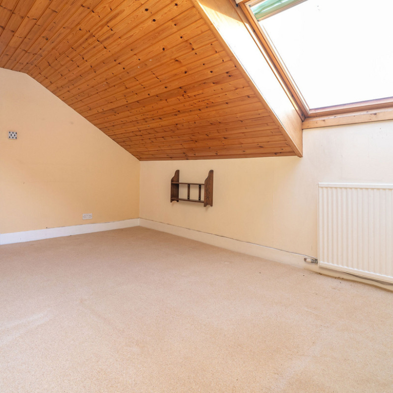 Adjacent lies an elegant south-facing principal double bedroom with plush carpeting, a cast iron fireplace, and working shutters. Two built-in cupboards offer plentiful storage.