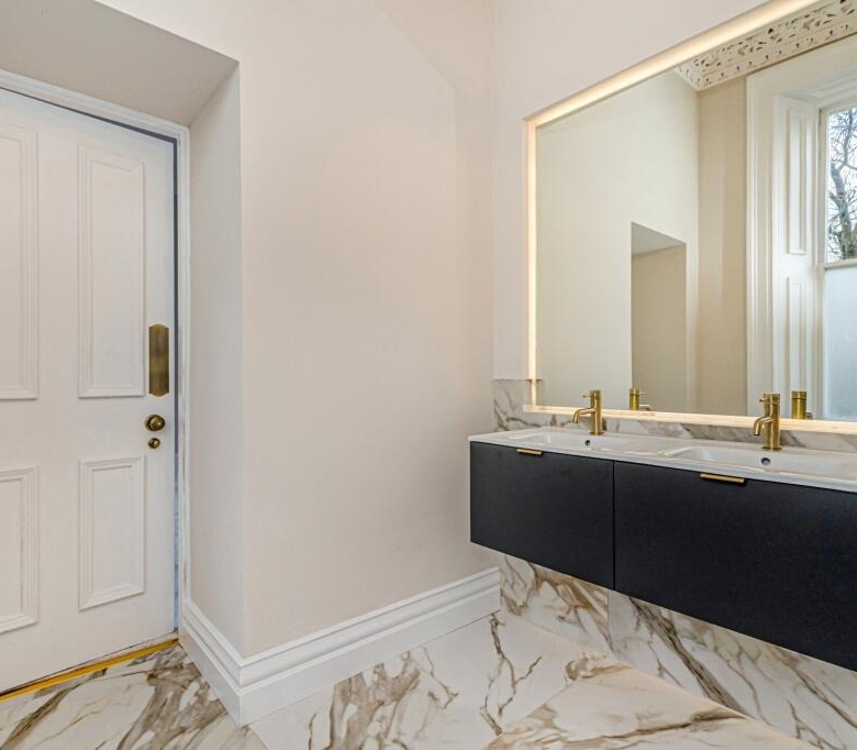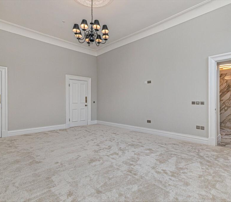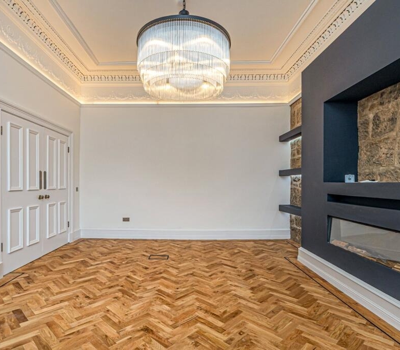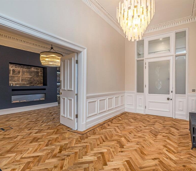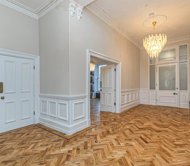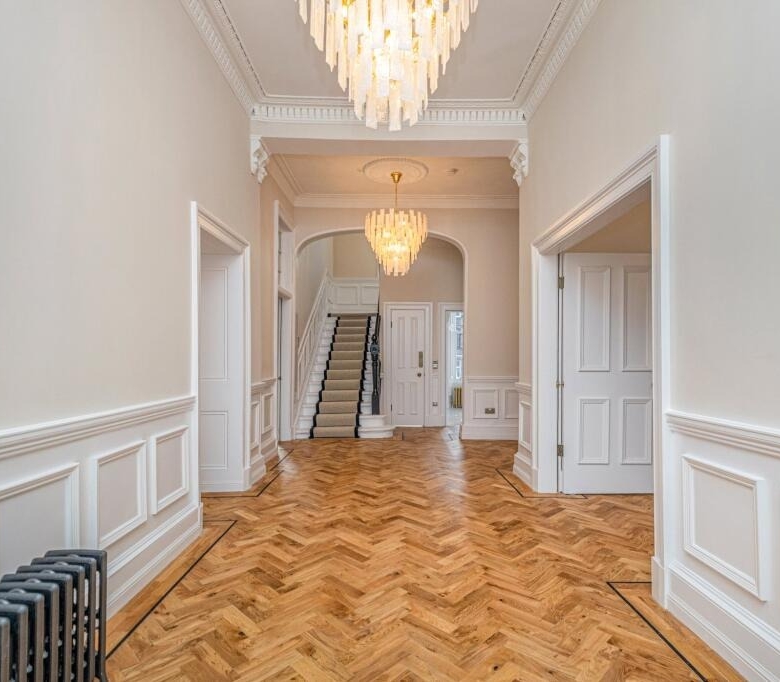 • Grand entrance via private ground floor main door this magnificent reception hall has immaculate herringbone flooring, wall panelling and ornate cornicing.