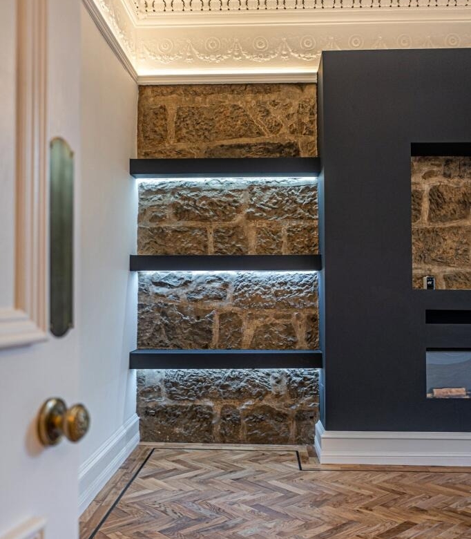 • Luxurious main lounge with wide double doors from the hall, two windows to the front, herringbone flooring, media wall/shelving, feature sandstone wall, focal point fire and ornate cornicing.