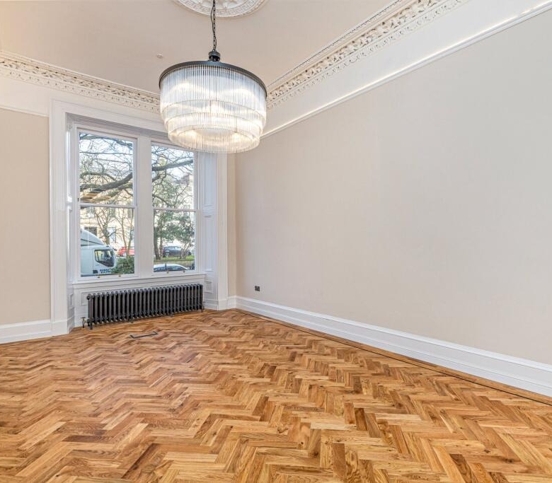 • Versatile family living room/formal dining room with two section window to the front, herringbone flooring and ornate cornicing.