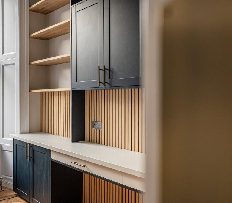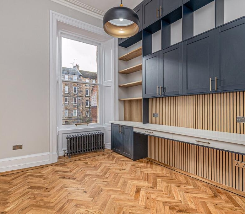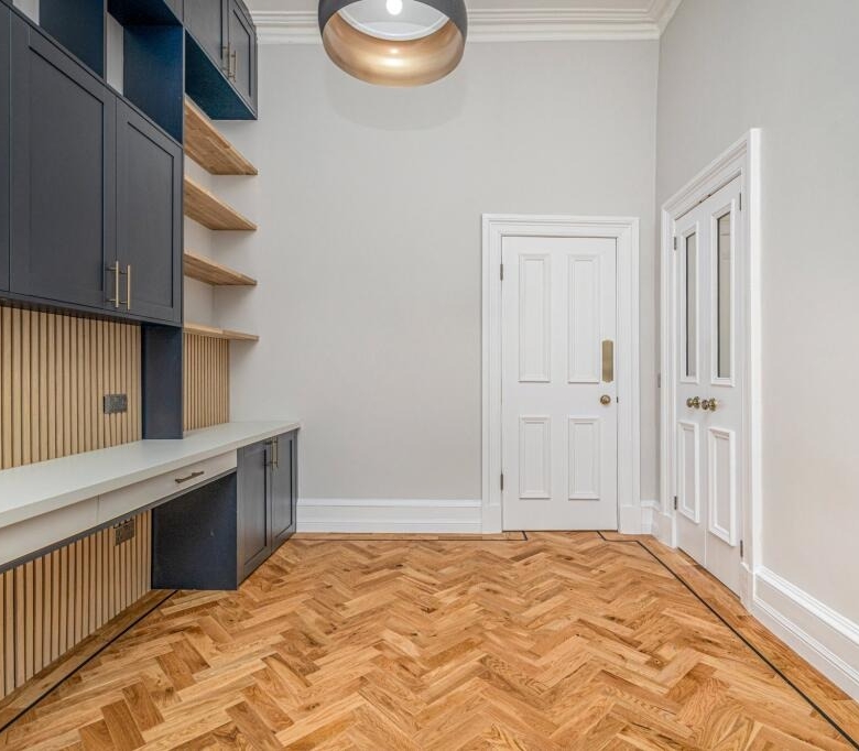 • Fantastic third public room which is fitted as a large home office with units, desks, cupboard and shelving. This room is extremely versatile and has a continuation of the herringbone flooring. Window to the rear.