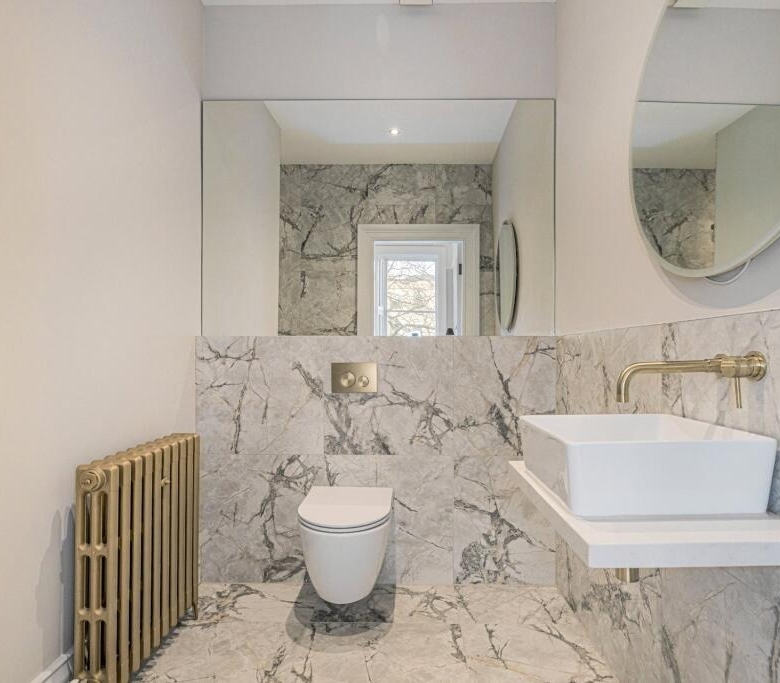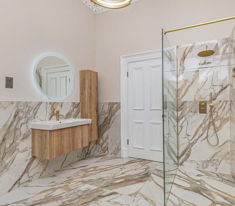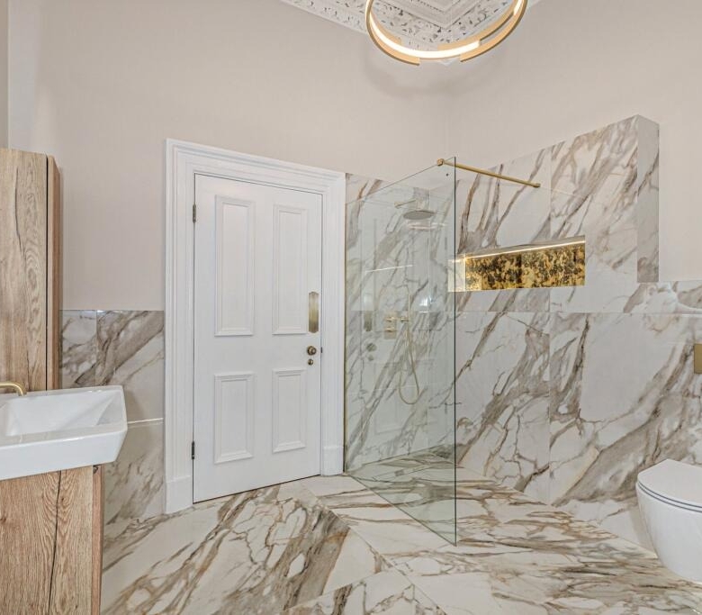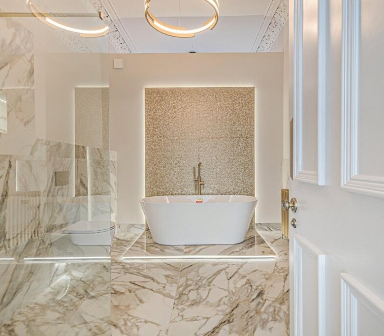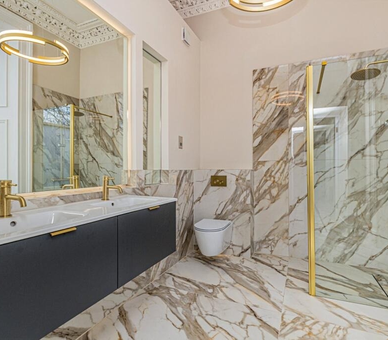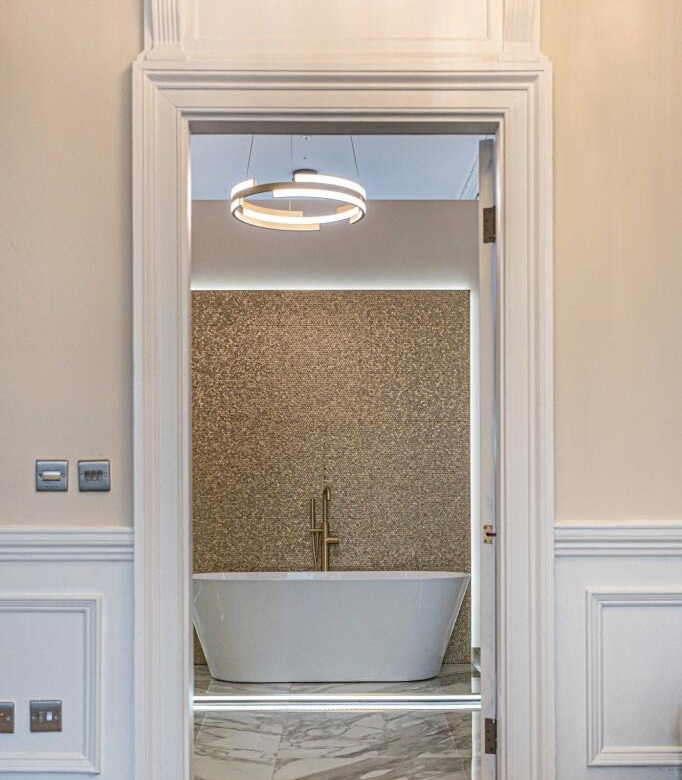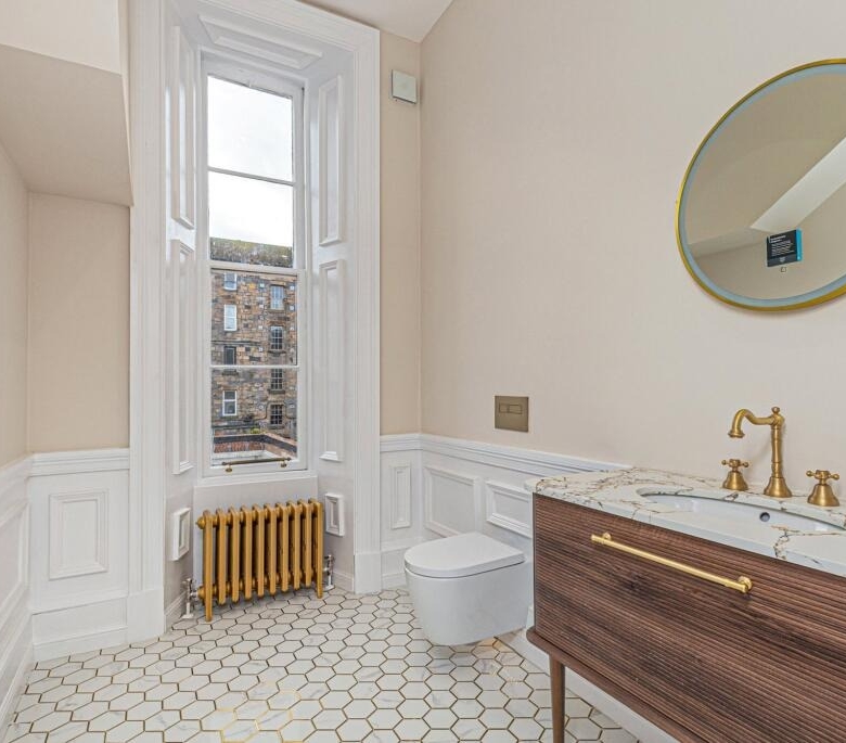• Incredible, newly fitted family bathroom with four piece suite including a free standing bath and a separate shower cubicle. Ornate cornicing.