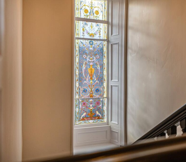 • Beautiful original stairway to half and upper landings with stunning painted glass window to the rear which is in four sections.